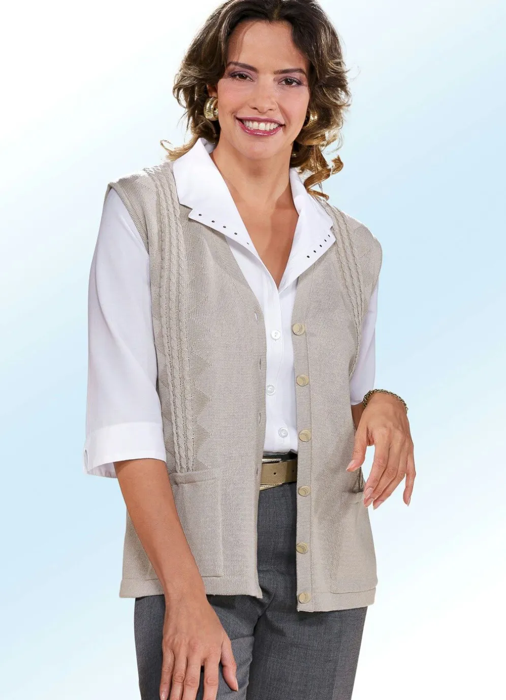 Stilvolle Strickweste in durchgeknöpfter Form, mit V-Ausschnitt, Zopfstreifen im Vorderteil sowie zwei aufgesetzten Taschen.