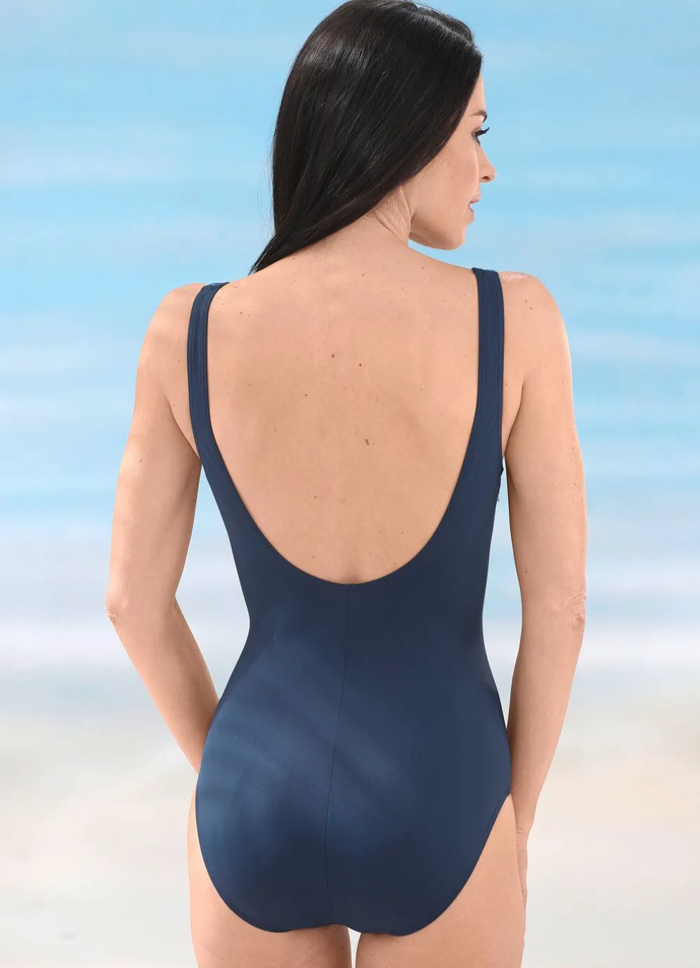 „Sunmarin“-Badeanzug in Marine, mit bunten, allover bedruckten Einsätzen im Vorderteil, Softschalen sowie Unterbrustband.