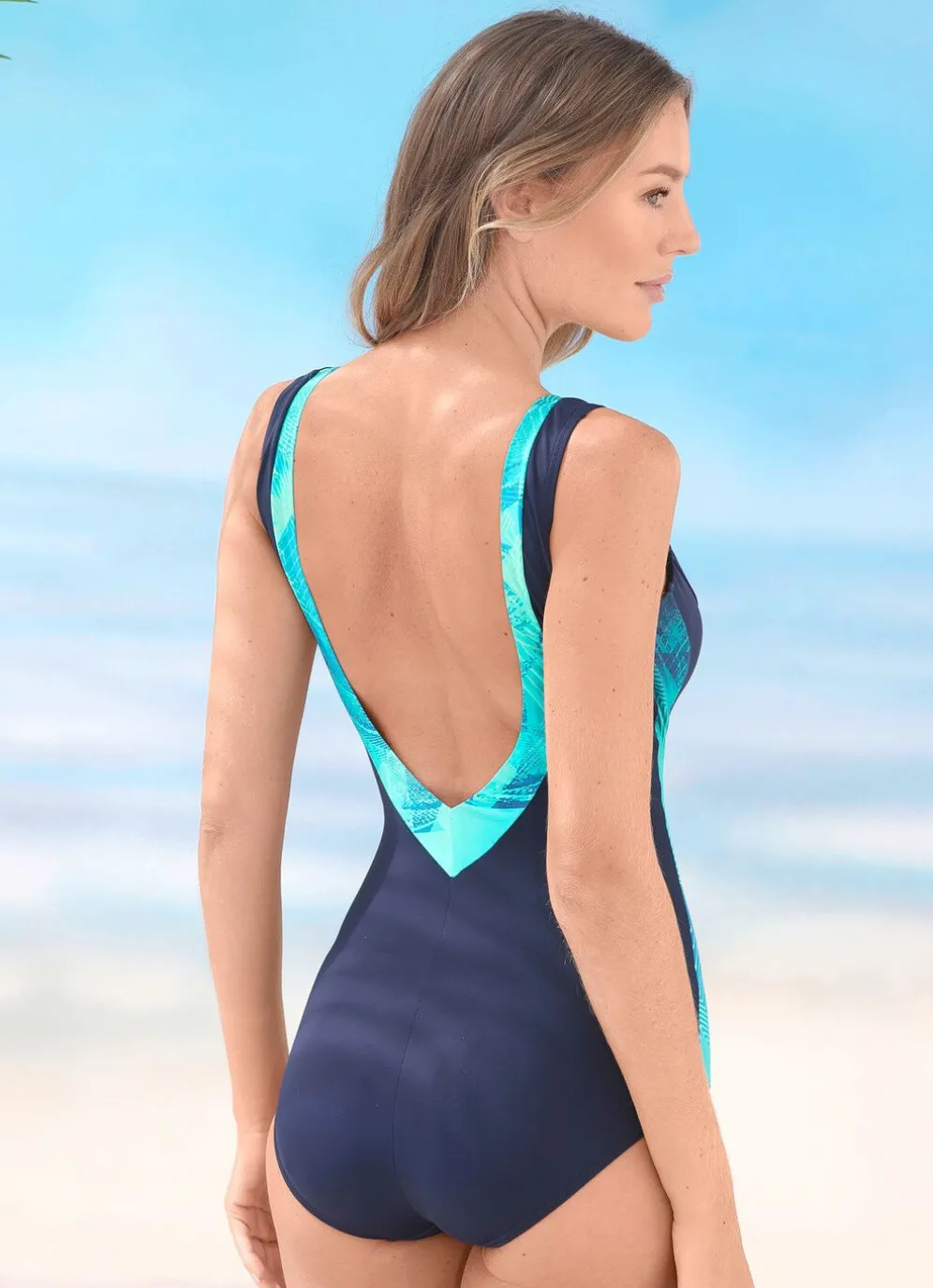 Marinefarbener „Sunmarin“-Badeanzug mit türkis-bunter Ausschnittblende rundum, seitlichen Einsätzen, Vollkorsage, Softschalen und Unterbrustband.