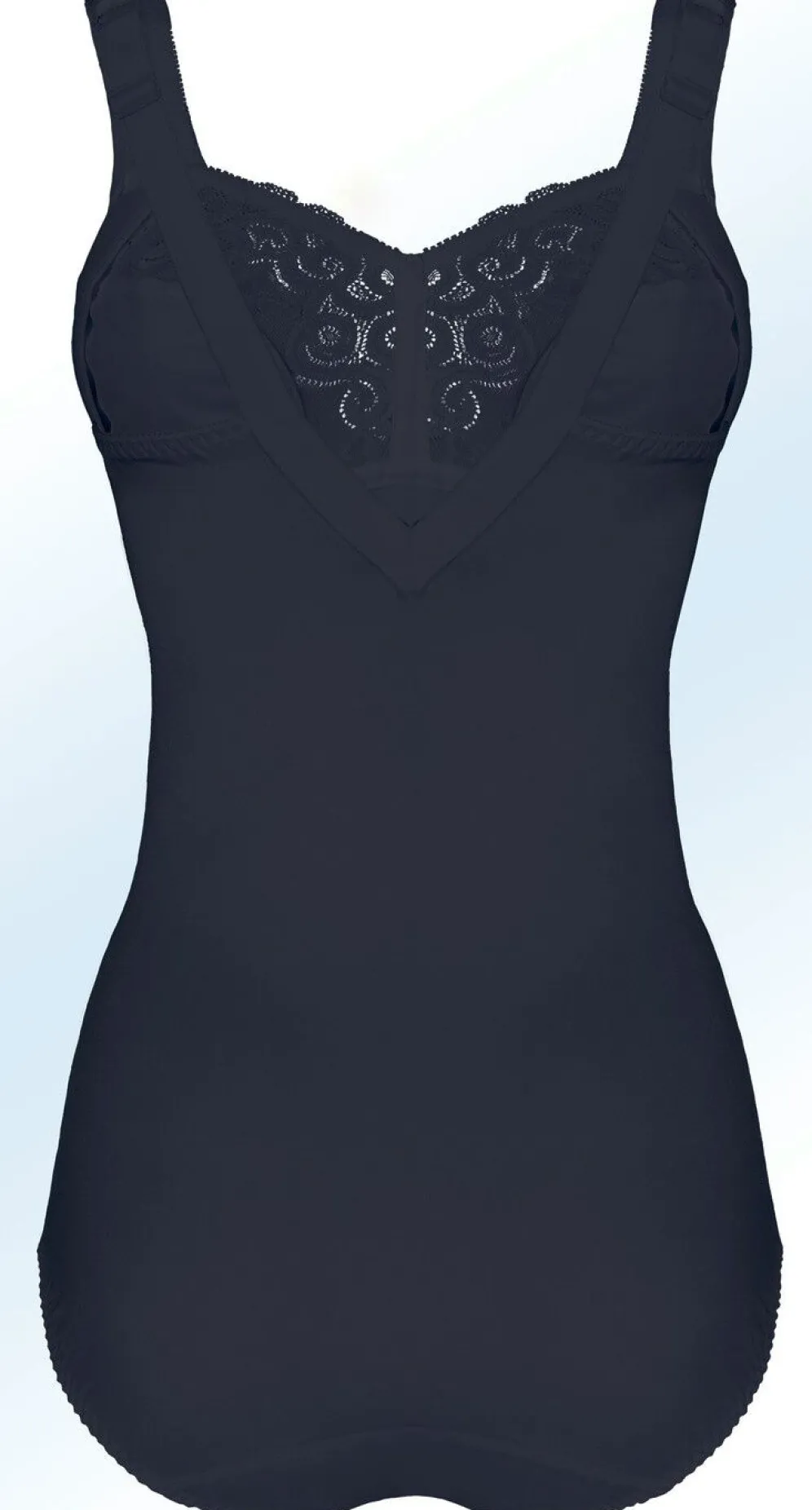 Hosenkorselett von „Swegmark of Sweden“, mit Elastikspitzeneinsätzen im Vorderteil, unterlegten Untercups, seitlicher, weich gepolsterter Cupverstärkung, verstärkter Bauchpartie, im Schulterbereich weich gepolsterten, verstellbaren Stretchträgern, rückwärtigem V-Ausschnitt sowie Hakenverschluss und Baumwolleinlage im Schritt.