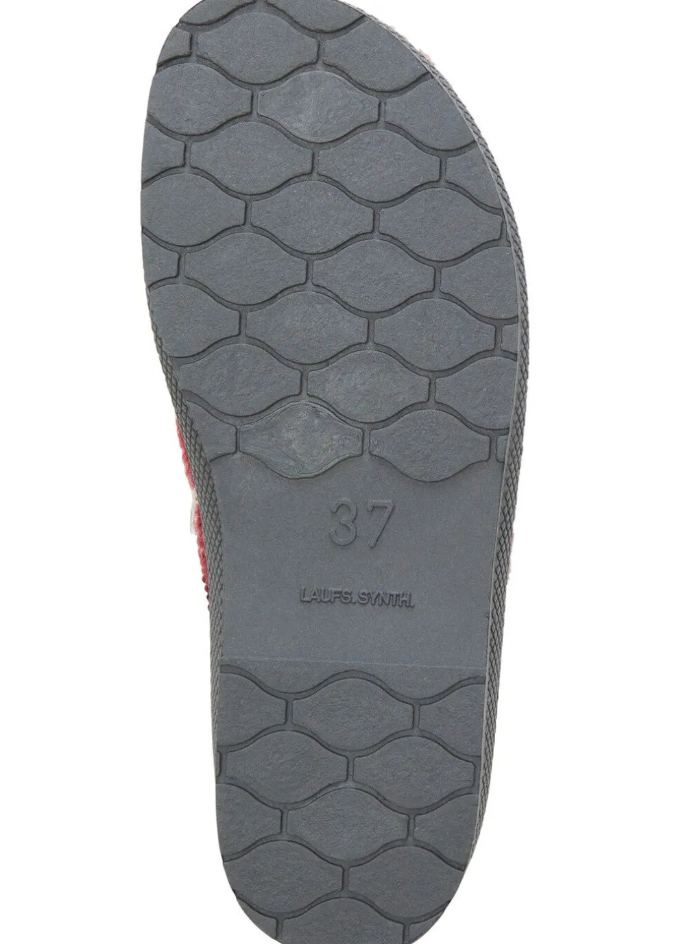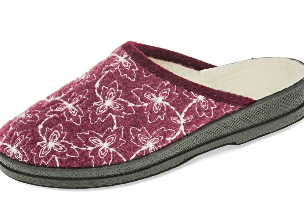 Textil-Pantoffel mit wollweißer Stickerei: Warmfutter und Fußbettbezug aus reiner Schurwolle, leichte PVC-Laufsohle sowie 20 mm Keilabsatz