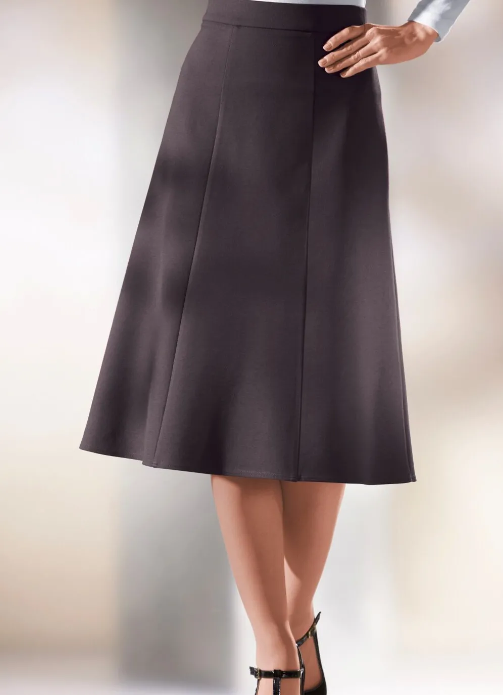 Mit sportivem Chic präsentiert sich dieser tragangenehme, lange 6-Bahnenrock in schicker A-Linie: bequeme Schlupfform, glatt anliegend dank des innen liegenden, unsichtbaren Rundum-Dehnbundes, nach unten hin in leicht ausgestellter Form. Länge ab Taille ca. 68 cm, bei K-Gr. ca. 64 cm.