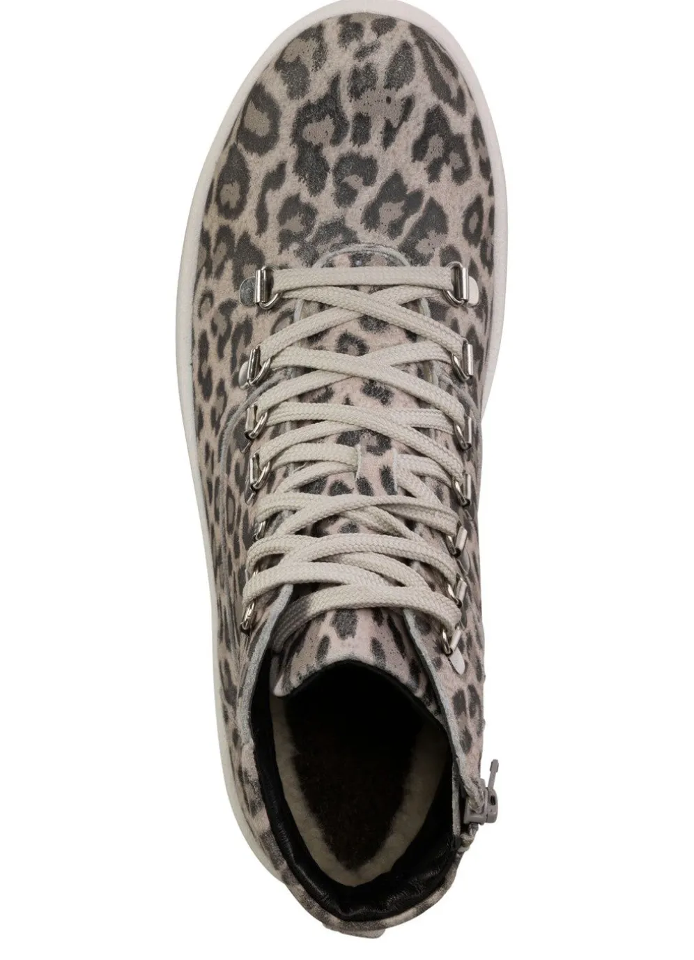 Boots in Sand-Grau, aus geprägtem Veloursleder mit rassigem Leo-Print: Weite H, mit Klimamembrane ausgestattet, Schnürung und Innenreißverschluss, Warmfutter aus 100% Polyester, herausnehmbare Decksohle, leichte PUR-Profilsohle sowie 25 mm Keilabsatz. Schafthöhe ca. 11 cm