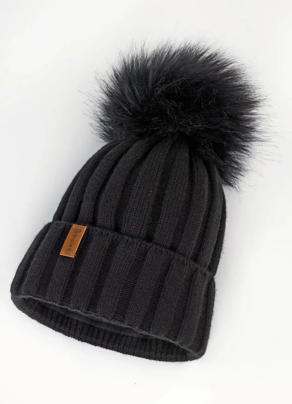 Trendige Damen-Mütze mit breitem Umschlag und Kunstfell-Bommel