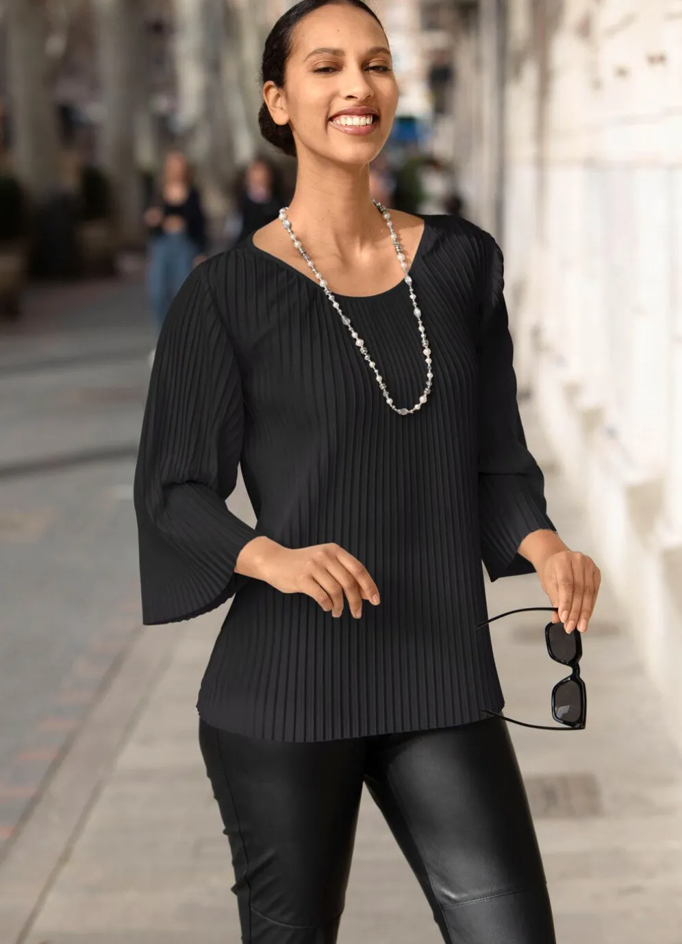 Modische Tunika mit rundem Halsausschnitt sowie duftigem Plissee im Vorderteil und an den 3/4-langen Ärmeln. Rückteil aus Elastik-Jersey.