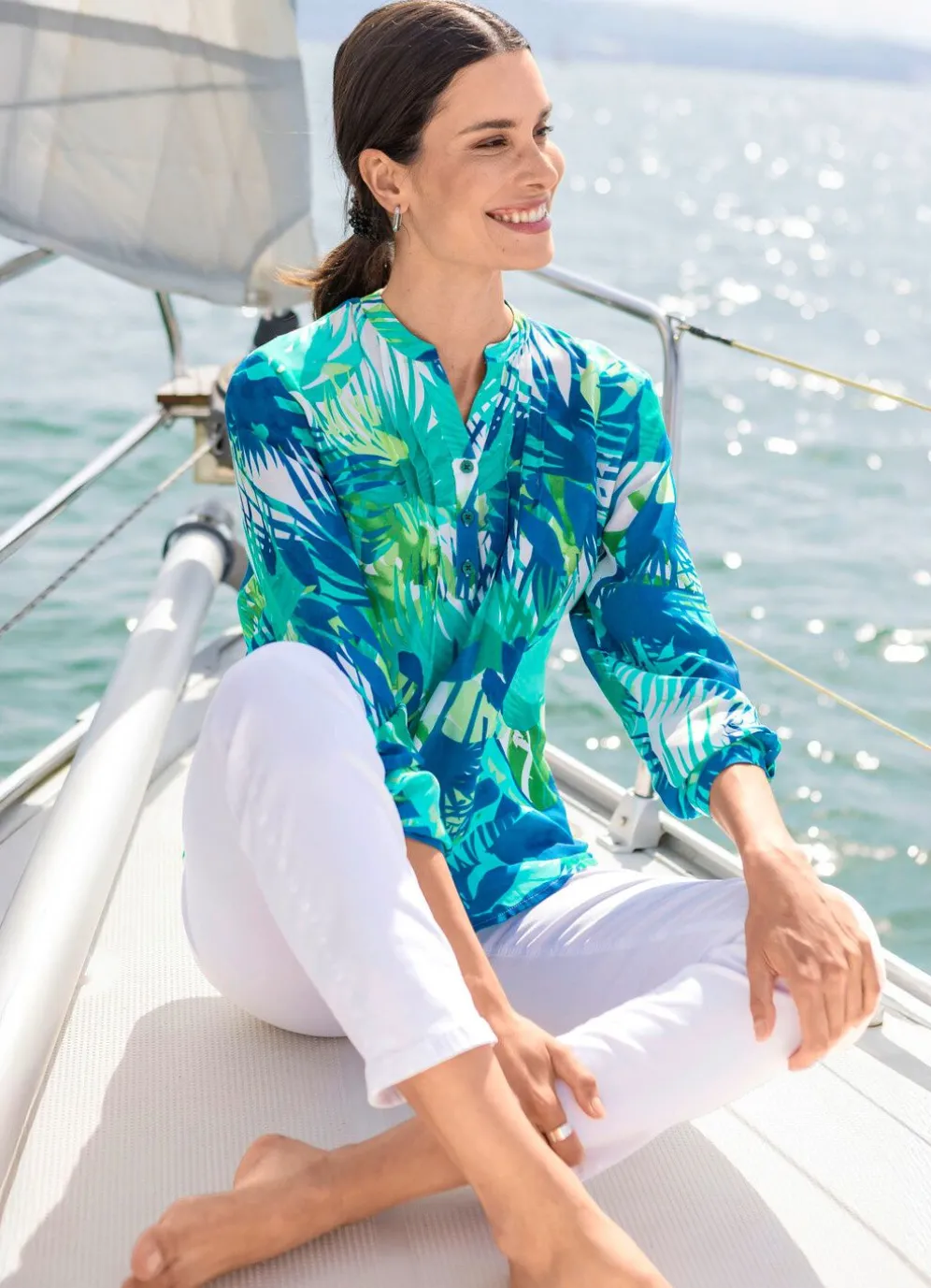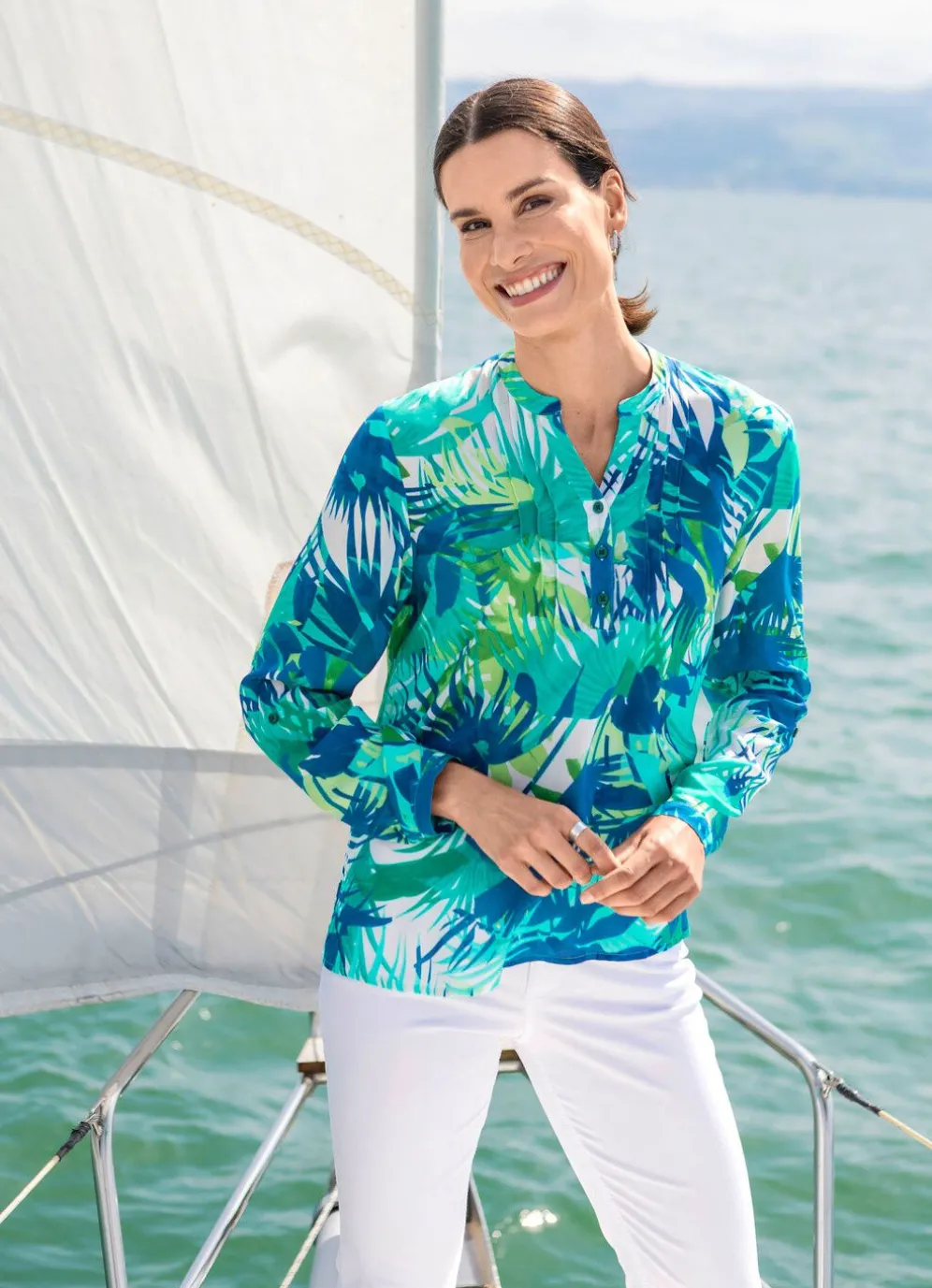 Traumhaft in Weiß-Türkis-Blau-Bunt dessinierte Tunika von laurakent, mit V-Ausschnitt am Stehkragen, toller Biesenzier mit aufspringenden Fältchen im Vorderteil, kurzer Knopfleiste sowie langen, auf 3/4-Länge krempelbaren Ärmeln mit schmalen Manschetten und knöpfbaren Riegeln.