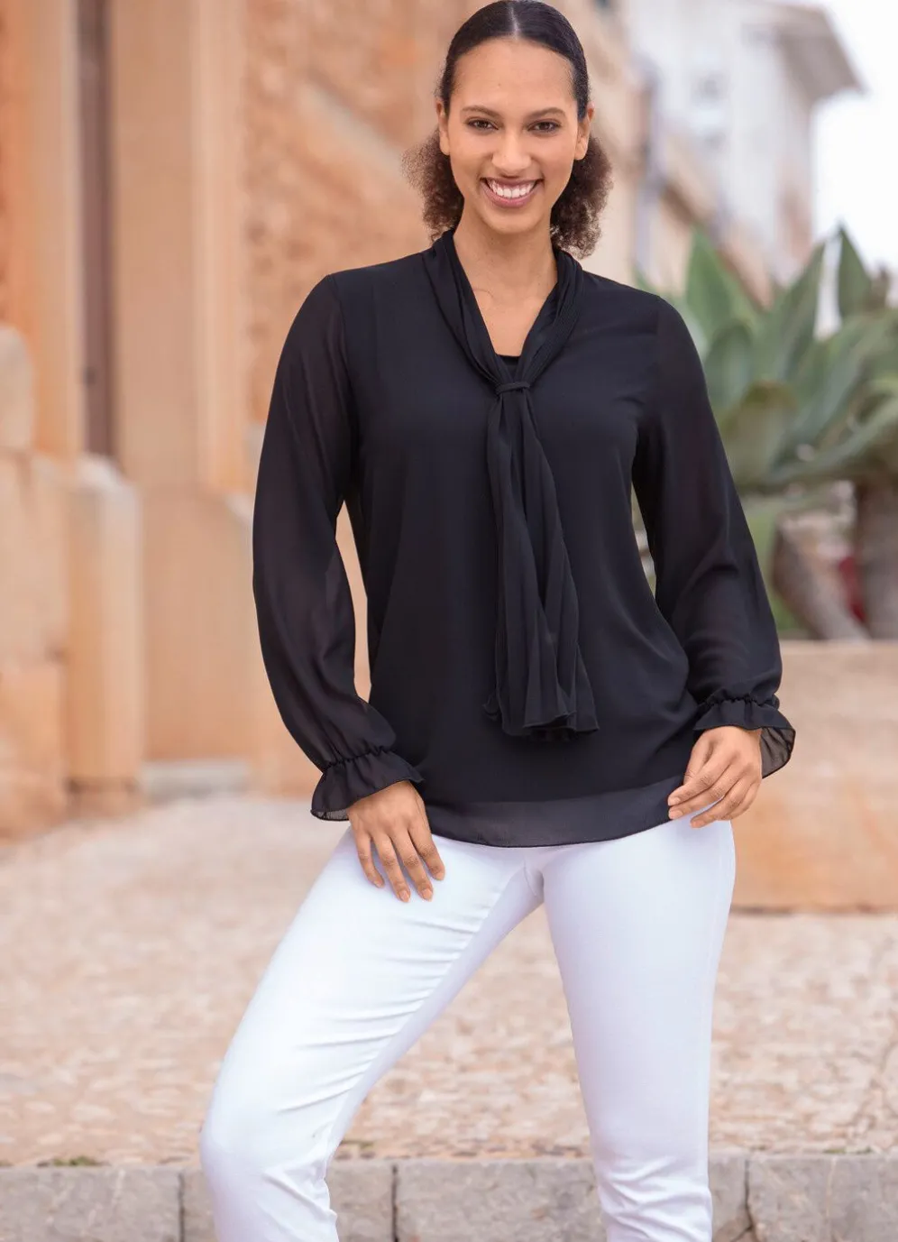 Unterlegte Tunika mit plissierter Bindeschluppe, rundem Halsausschnitt sowie duftig transparenten langen Ärmeln mit elastisch gesmokten Abschlüssen.