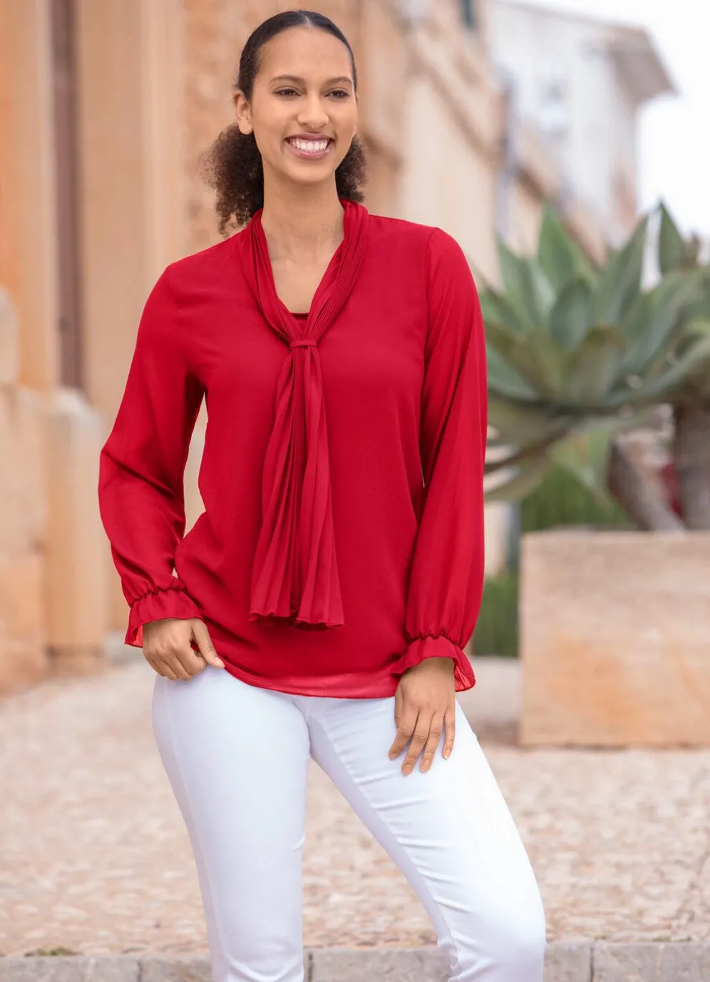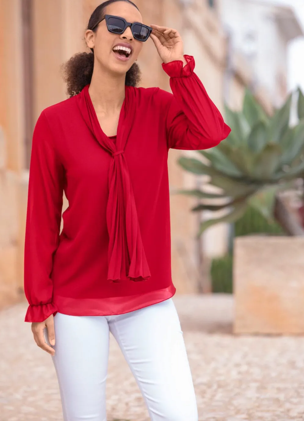 Unterlegte Tunika mit plissierter Bindeschluppe, rundem Halsausschnitt sowie duftig transparenten langen Ärmeln mit elastisch gesmokten Abschlüssen.