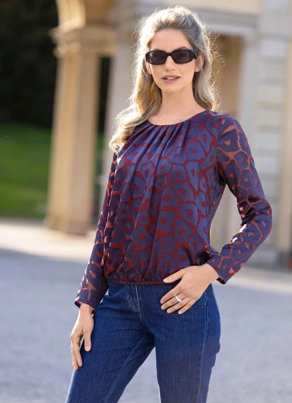 Edle Tunika mit hübscher Faltenlegung am runden Halsausschnitt, langen Ärmeln, elastischer Saumabschluss rundum.