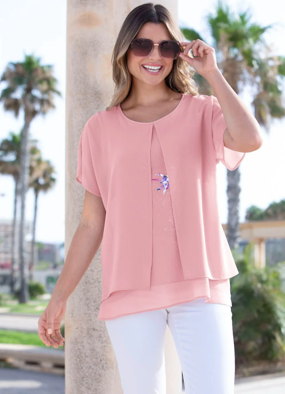 Schöne Tunika in Rosé, mit rundem Halsausschnitt, duftigem Besatz mit Schlitz und dekorativem Motiv-Druck mit Schmucksteinen im Vorderteil sowie kurzen, überschnittenen Ärmeln.