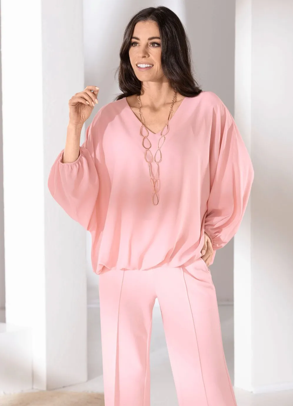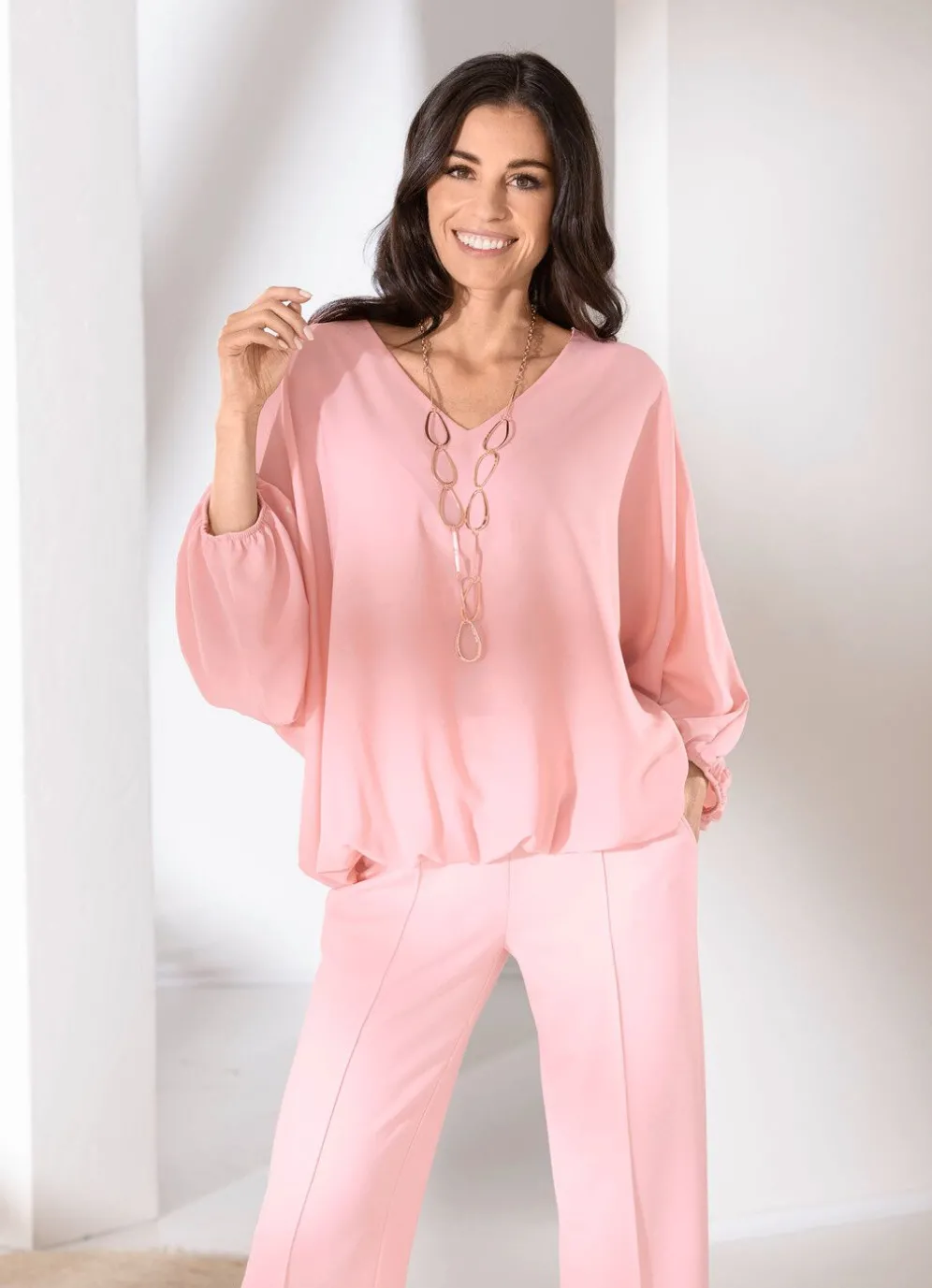 Schöne Tunika in Rosé, mit V-Ausschnitt, langen Raglanärmeln mit elastischen Abschlüssen sowie elastischem Saumabschluss rundum.