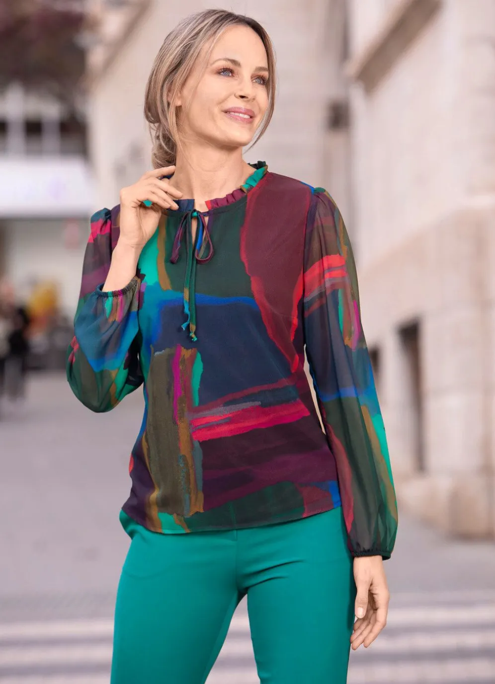 Jedes Teil ein Unikat! Farbenfrohe Tunika von TIZIA mit kurzem Schlitz und Bindebändchen am Rüschenkragen, duftig, transparente lange Ärmel mit elastischen Abschlüssen.
