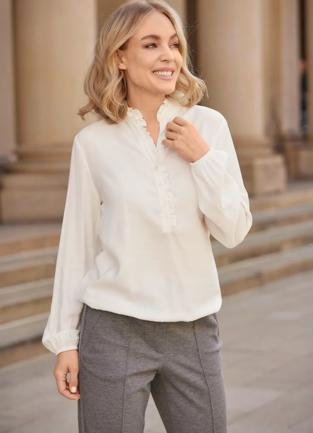 Ecrufarbene Tunika von B/ANCA: mit Rüschenzier entlang des Stehkragens und der kurzen Knopfleiste im Vorderteil. Lange Ärmel mit elastischen Abschlüssen sowie elastischer Saumabschluss.