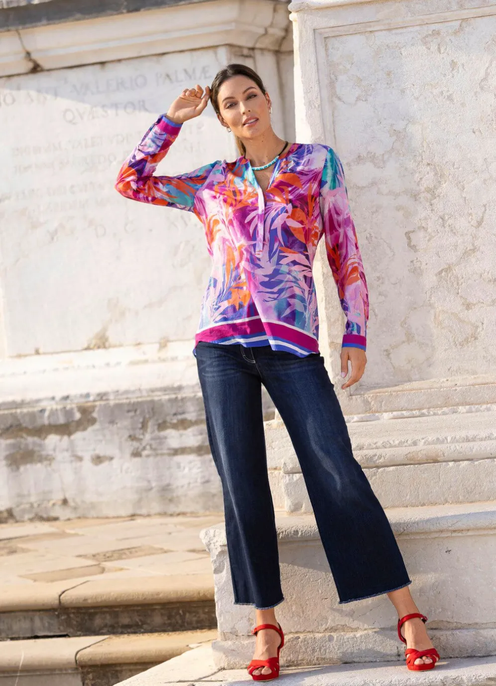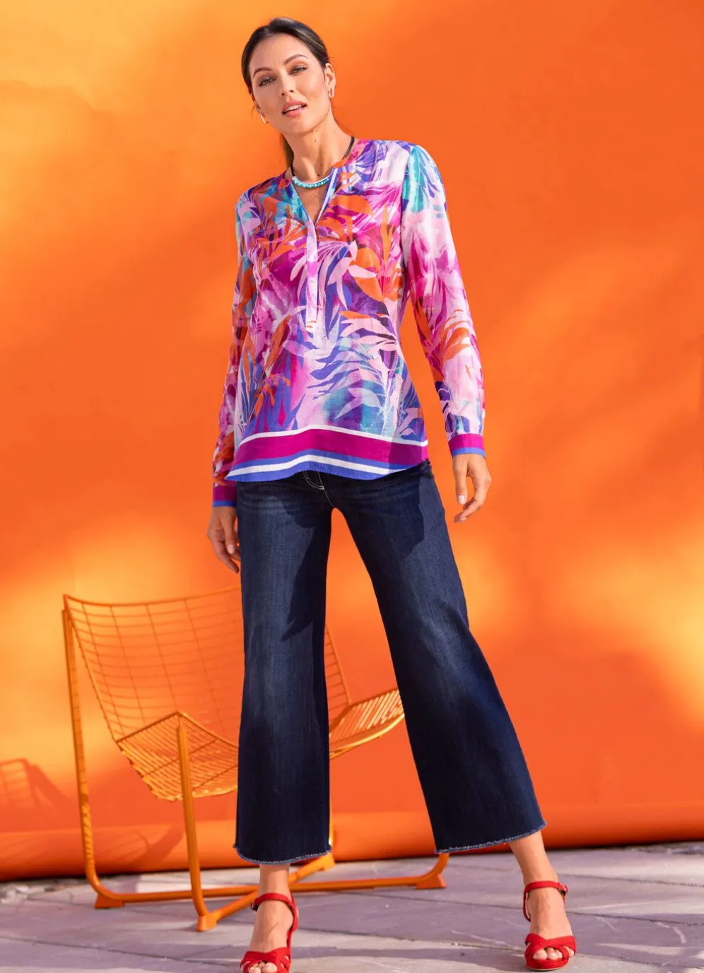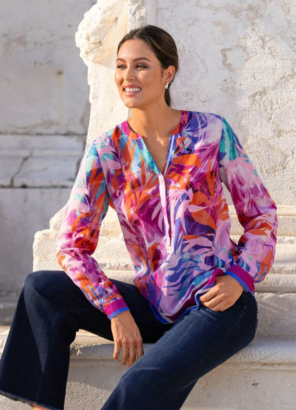 Farbenfrohe Tunika mit farbbrillantem Druck in Koralle-Fuchsia-Rosé-Bunt, hübscher Bändchenzier am V-Ausschnitt mit Stehkragen, kurzer, verdeckter Knopfleiste sowie schöner Bordüre an den langen Manschettenärmel und am Saumabschluss.