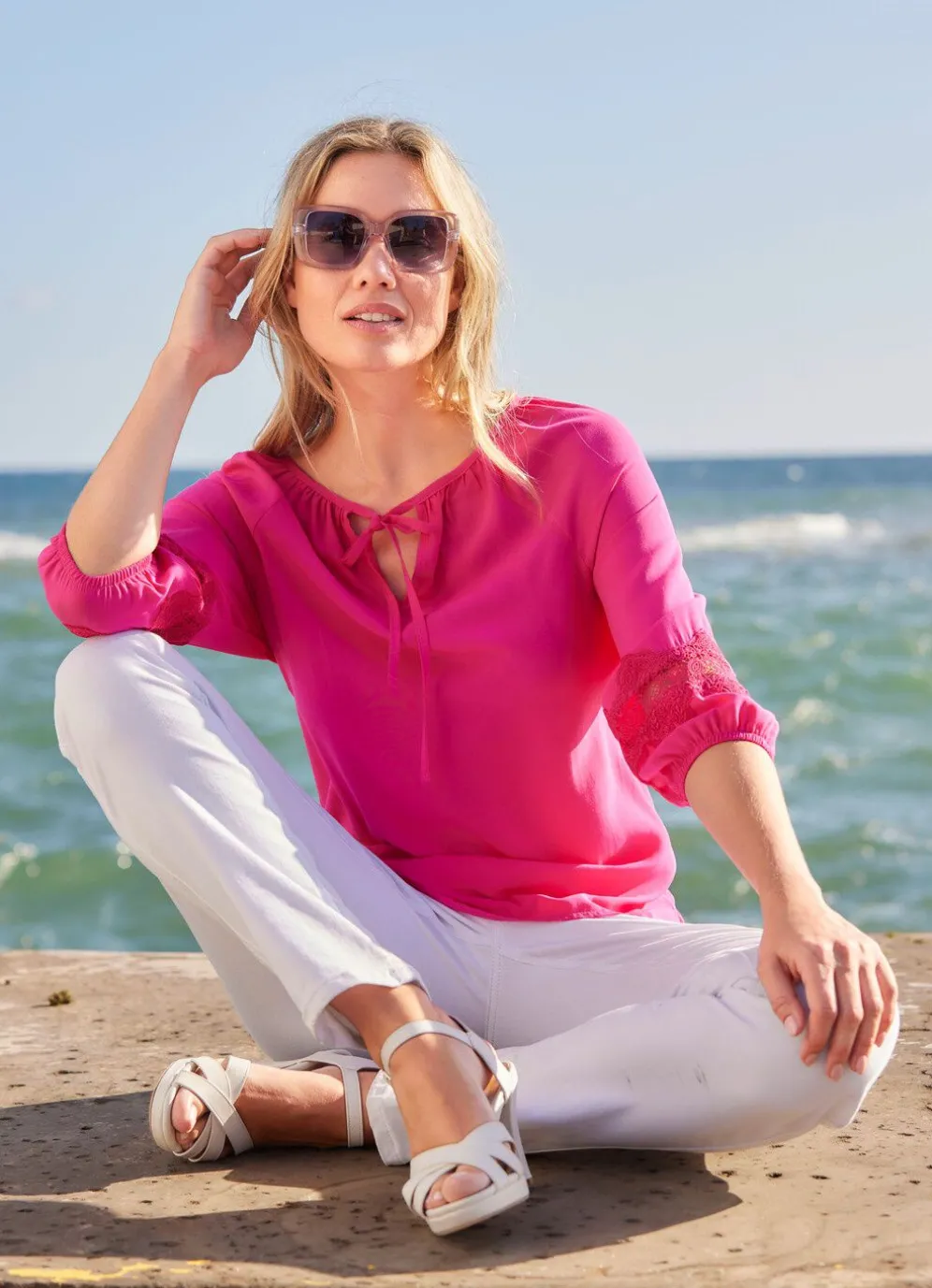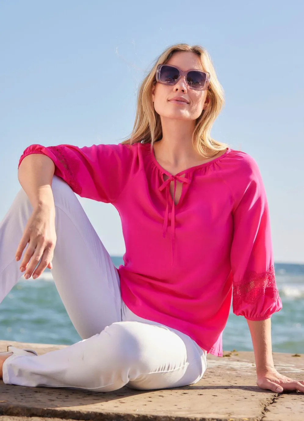 Topmodische Tunika in Pink von laurakent, mit kleinem Schlitz am runden Halsausschnitt, Bindeband im Vorderteil, Stickerei-Einsatz an den elastischen, 3/4-langen Ärmeln sowie zwei Seitenschlitzen.
