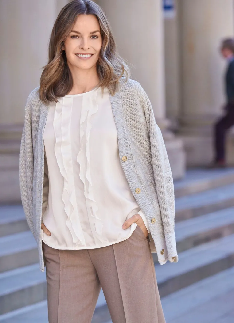 Langarm-Tunika von TIZIA mit rundem Halsausschnitt, verspielten Stufen-Volants im Vorderteil, schmalen Manschetten sowie Seitenschlitzen.