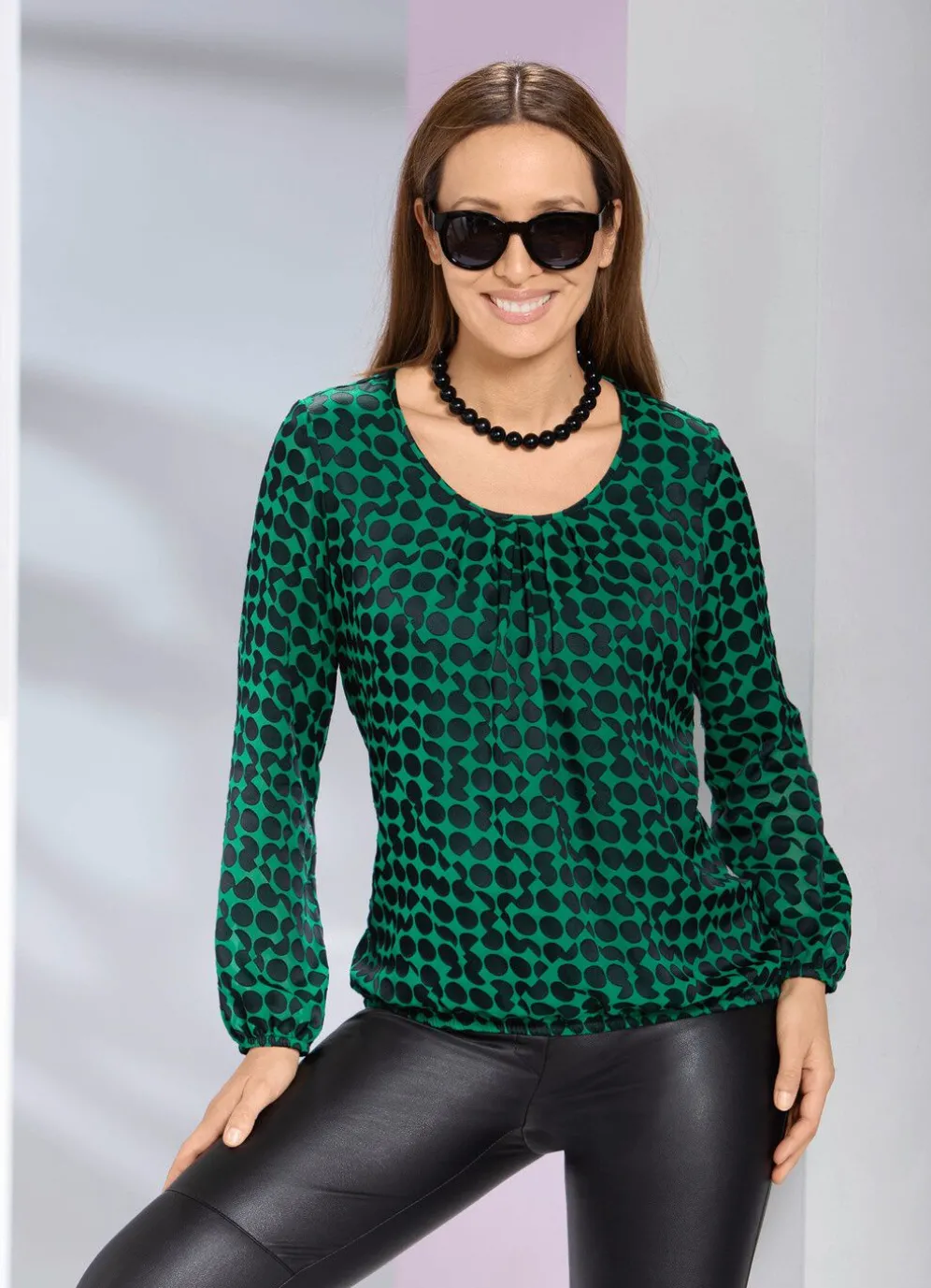 Schicke, unterlegte, grün-schwarze Tunika mit Tupfen und gefälteltem, rundem Halsausschnitt, transparenten, langen Ärmeln mit elastischen Abschlüssen sowie elastischem Saumabschluss rundum.