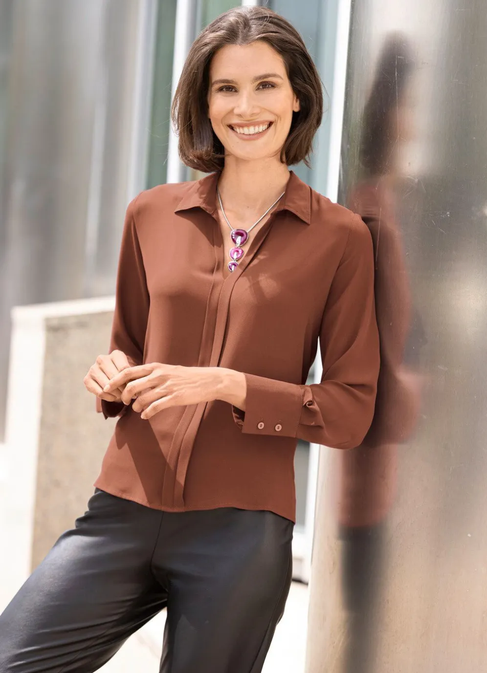 Bezaubernde Tunika mit V-Ausschnitt an der aparten Kragenlösung, Biesenzier im Vorderteil, langen Ärmeln mit breiten Manschetten sowie abgerundetem Saum.
