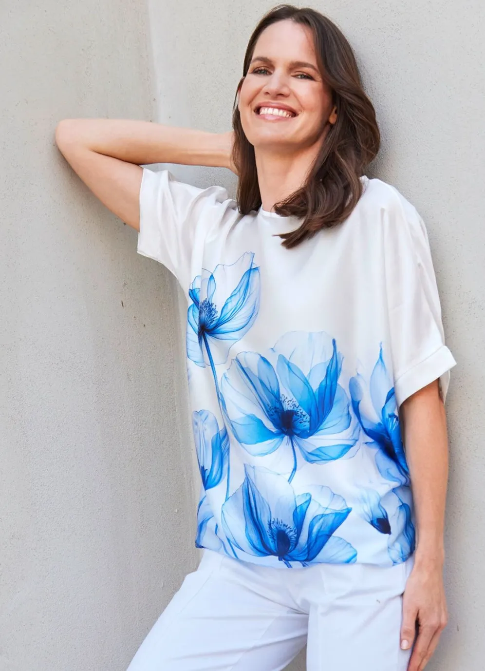 Floral dessinierte Tunika von TIZIA in Weiß-Mint: runder Halsausschnitt, floraler Druck im Vorderteil sowie kurze, überschnittene Ärmel.
