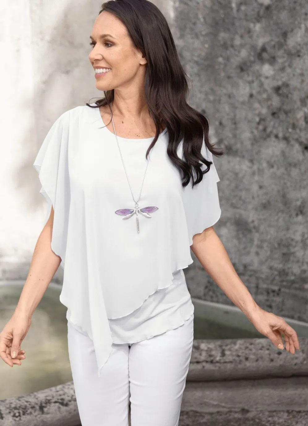 Schicke Poncho-Tunika mit rundem Halsausschnitt, eingearbeitetem Top, überschnittenen Ärmeln sowie asymmetrischem Poncho-Besatz.