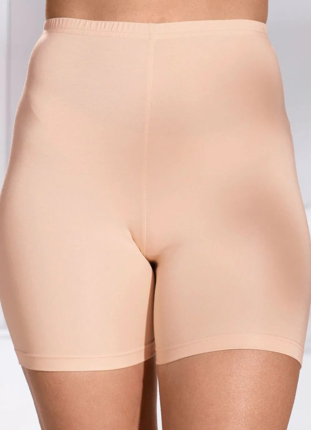 Vielseitig kombinierbare Unterzieh-Radlerhose aus superweichem, bi-elastischem Feinjersey, der sich angenehm wie eine zweite Haut anschmiegt und das Scheuern an den Schenkeln verhindert. Die kurze Hose mit Elastikbund ist ideal für das Tragen unter Tuniken, Kleidern und Röcken geeignet und damit auch ein modisches Accessoire, das Sicherheit bietet bei unvorhergesehenen Windböen. Die Qualität: 60% Viskose, 31% Polyamid, 9% Elastan; innere Beinlänge bei Gr. M ca. 14 cm