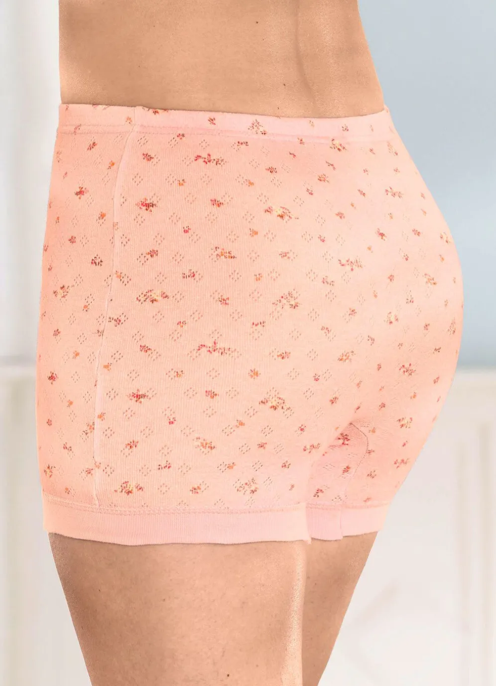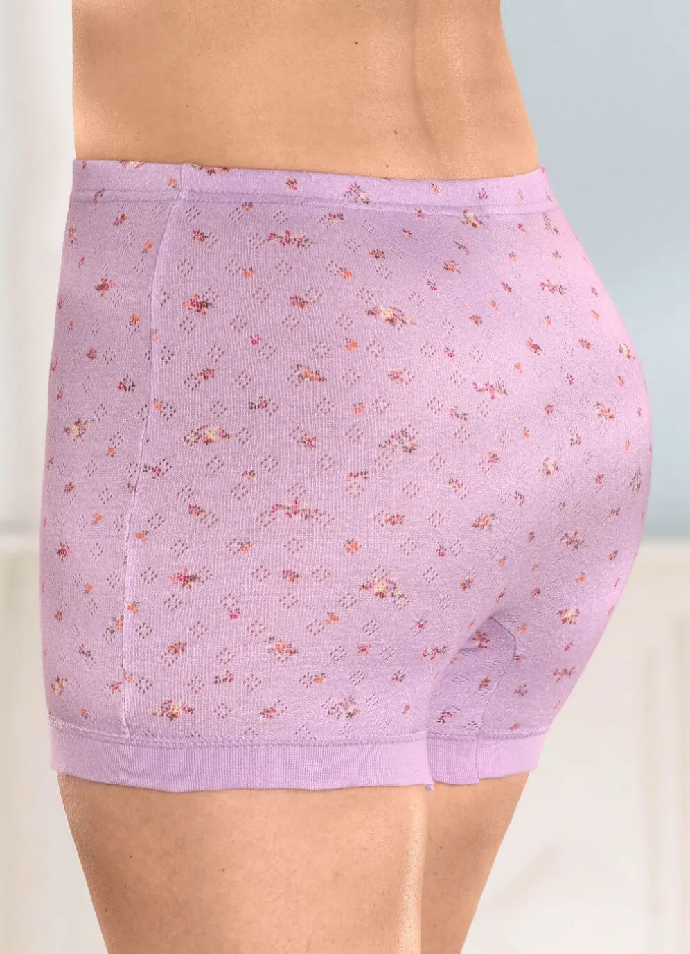 Schlüpfer mit buntem Blümchendruck und feinem Ajour-Dessin sowie Gummizug im Bund.