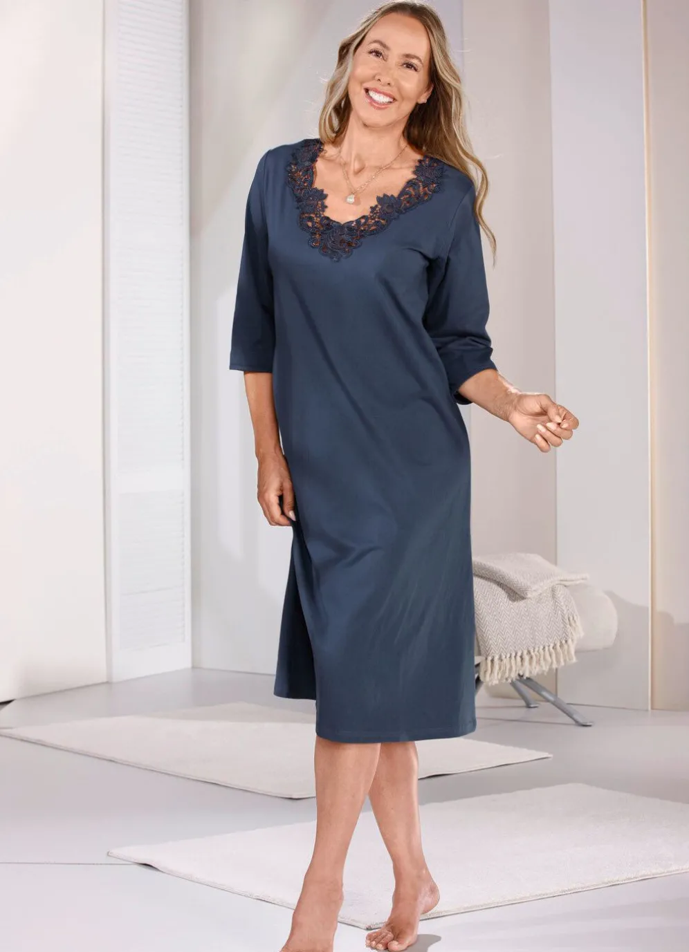 Wadenlanges Nachthemd mit Stickereispitze im Vorderteil sowie 3/4-langen Ärmeln.