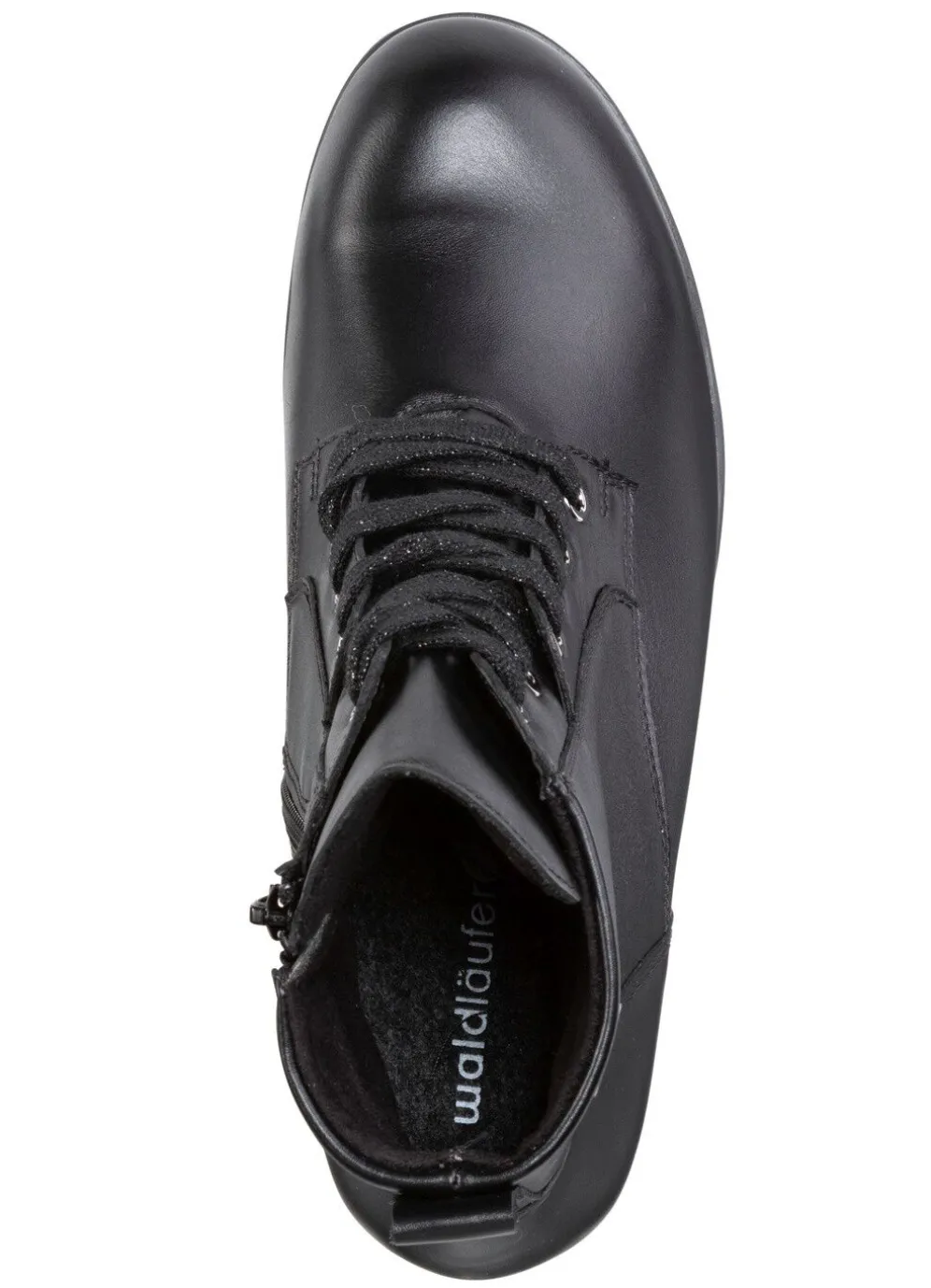 Stiefeletten aus Nappaleder, mit Schnürung und praktischem Innenreißverschluss: Weite H, mit Klimamembrane ausgestattet, Textilfutter, herausnehmbares Filzfußbett, leichte TR-Luftpolster-Riffelsohle sowie 35 mm Absatz. Schafthöhe ca. 12 cm