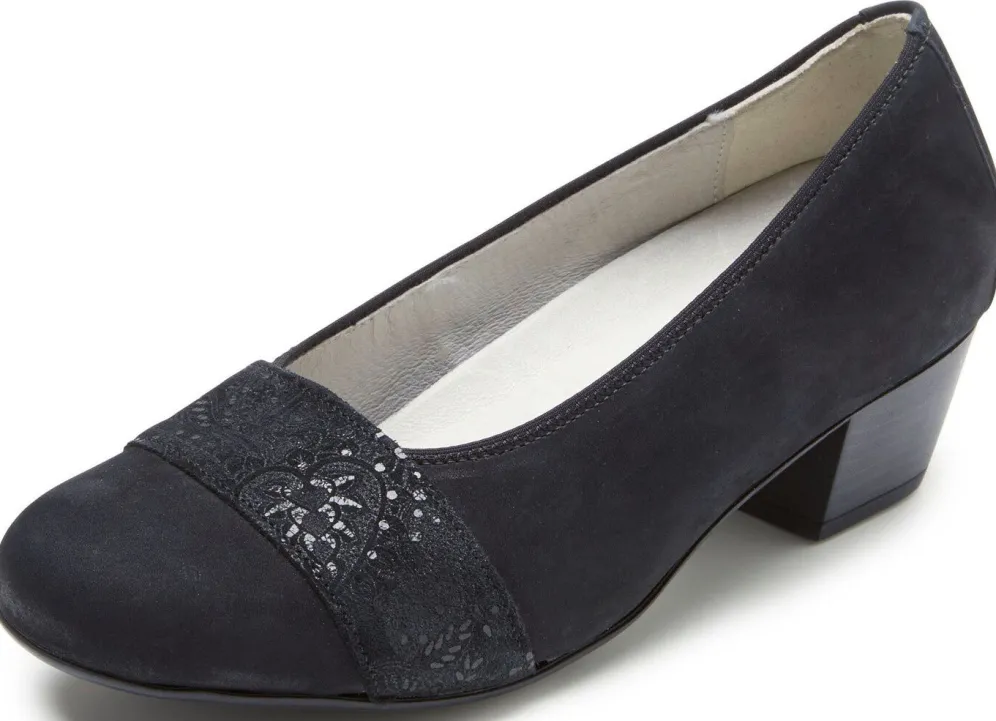 Schwarze Pumps aus edlem Nubukleder, mit dezent geprägter Lederspange: in Weite K, Rundum-Gummizug, Lederfutter, herausnehmbares Lederfußbett, TPU-Riffelsohle sowie 40 mm Absatz