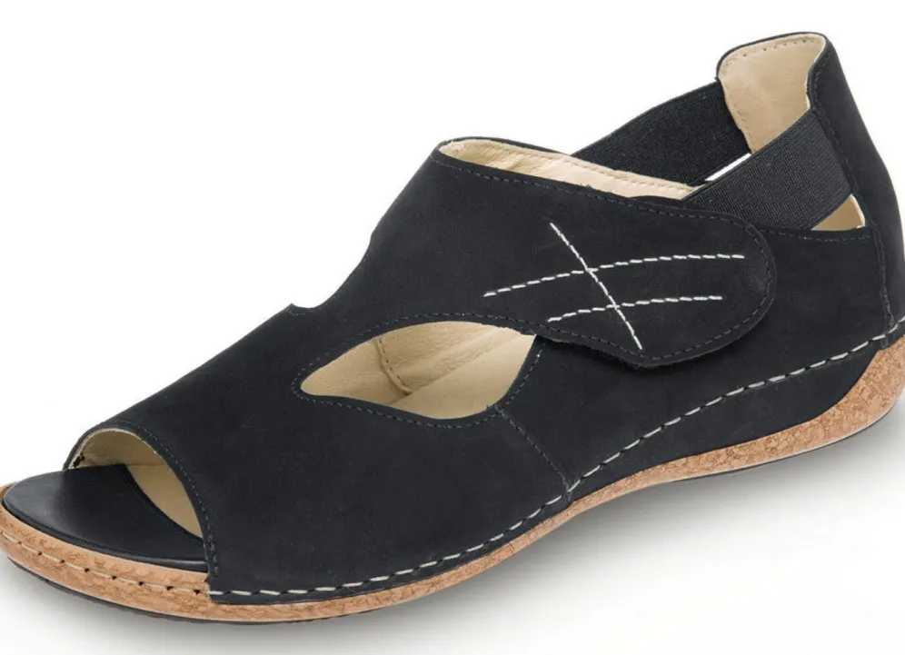 Hochwertige Sandalen aus edlem Rind-Nubukleder, in Ecru-Bunt aus floralem Textilmaterial: Weite H, verstellbare Klettspange, Lederfutter, herausnehmbares Lederfußbett, leichte PU-Riffelsohle sowie 25 mm Keilabsatz
