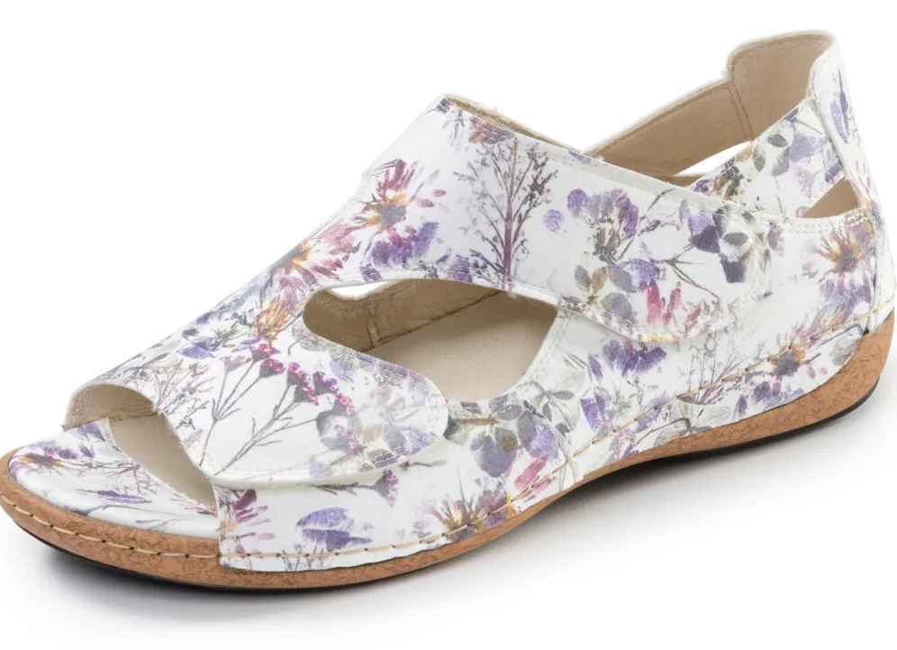 Hochwertige Sandalen aus edlem Rind-Nubukleder, in Ecru-Bunt aus floralem Textilmaterial: Weite H, verstellbare Klettspange, Lederfutter, herausnehmbares Lederfußbett, leichte PU-Riffelsohle sowie 25 mm Keilabsatz
