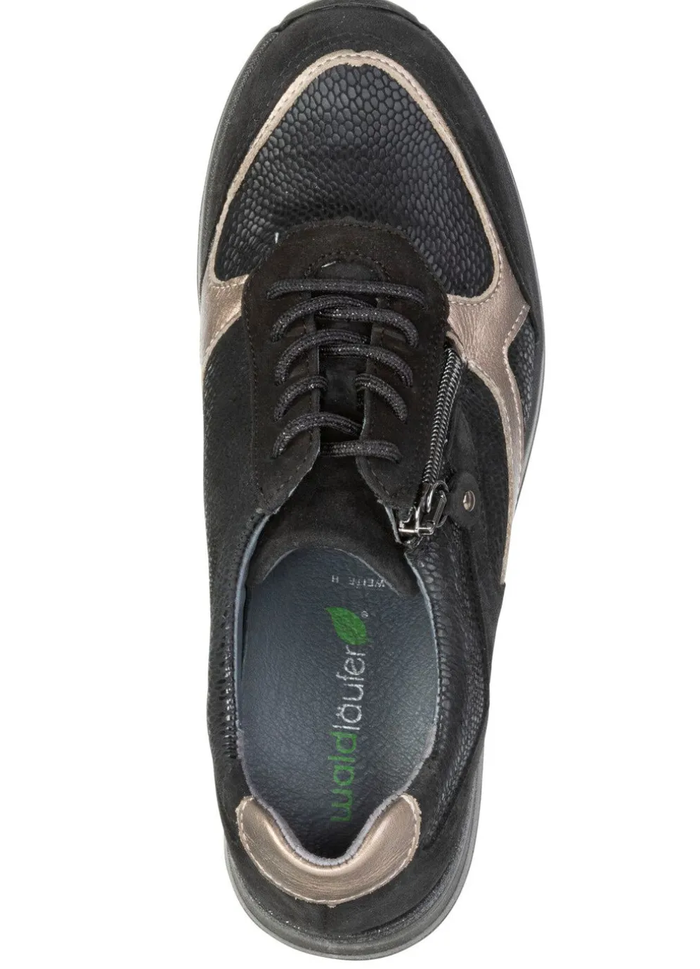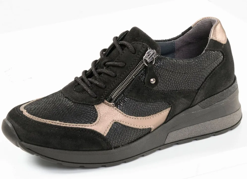 Sneaker in Schwarz-Bronze, aus teilweise geprägtem Veloursleder mit Metallic-Besätzen: Weite H, Schnürung, seitlicher Reißverschluss, ledergefüttertes Quartier, herausnehmbares Lederfußbett, leichte Synthetik-Luftpolster-Profilsohle sowie 30 mm Keilabsatz