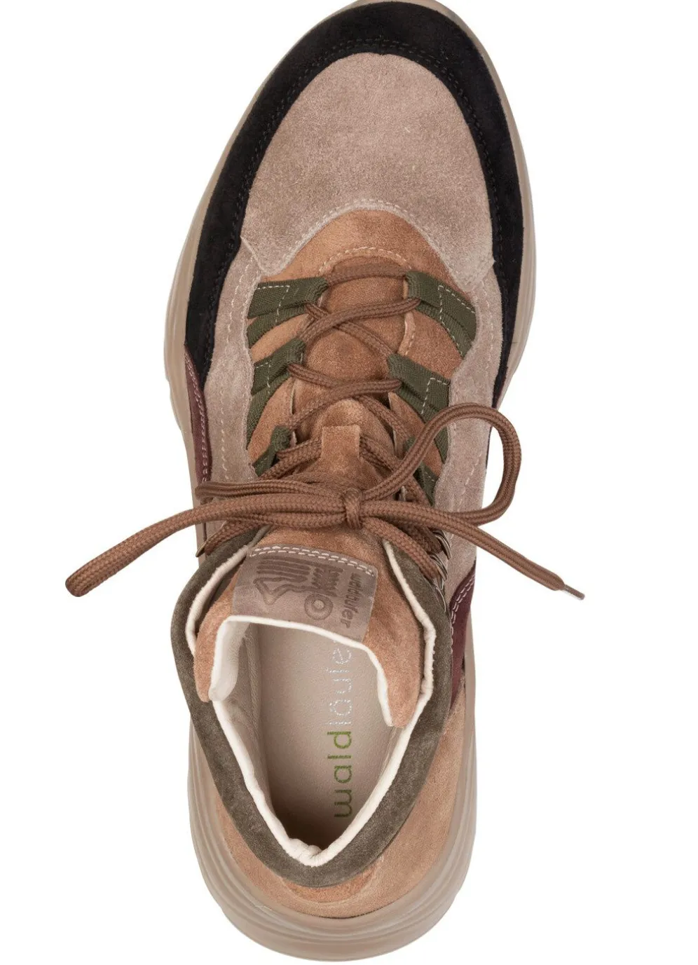 Stiefeletten in Taupe-Multicolor aus hochwertigem Veloursleder mit Schnürung und gepolstertem Schaftrand: Weite H, ledergefüttertes Quartier, herausnehmbares Lederfußbett, superleichte EVA-Laufsohle sowie 20 mm Keilabsatz. Schafthöhe ca. 11 cm
