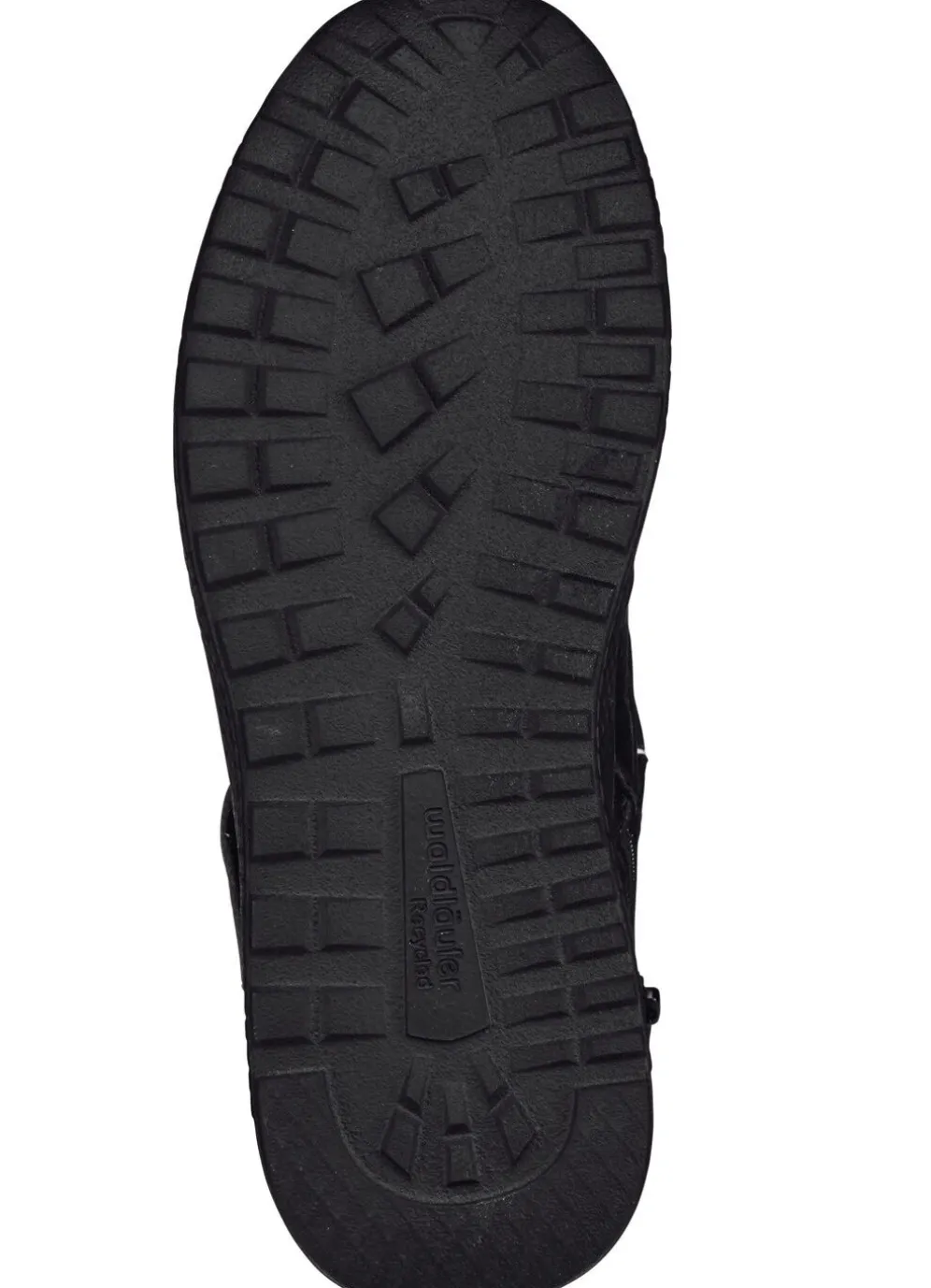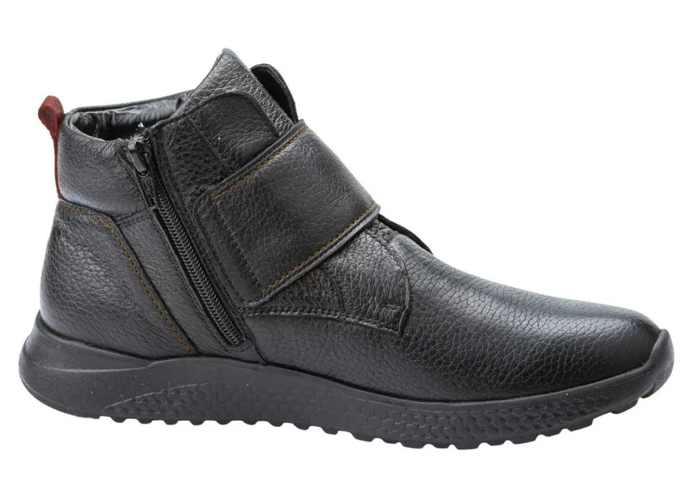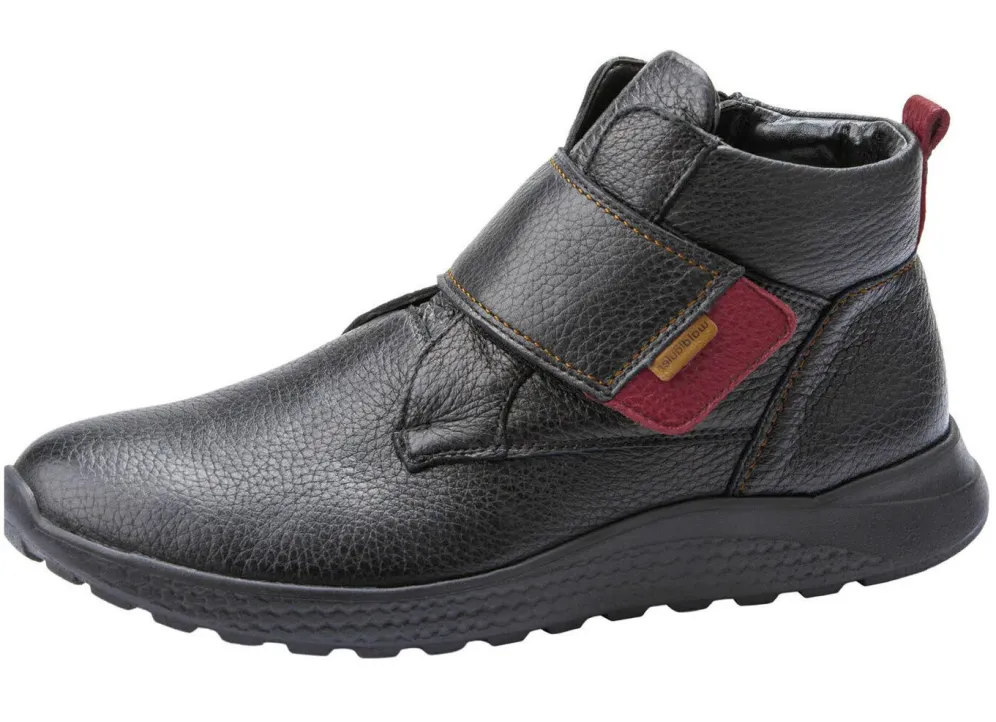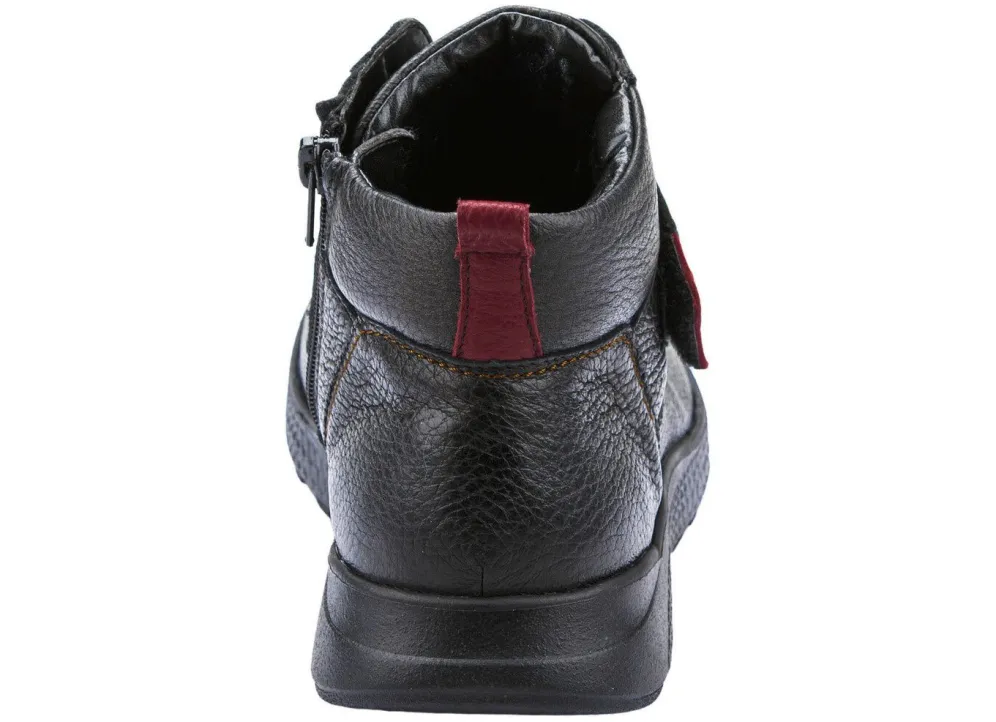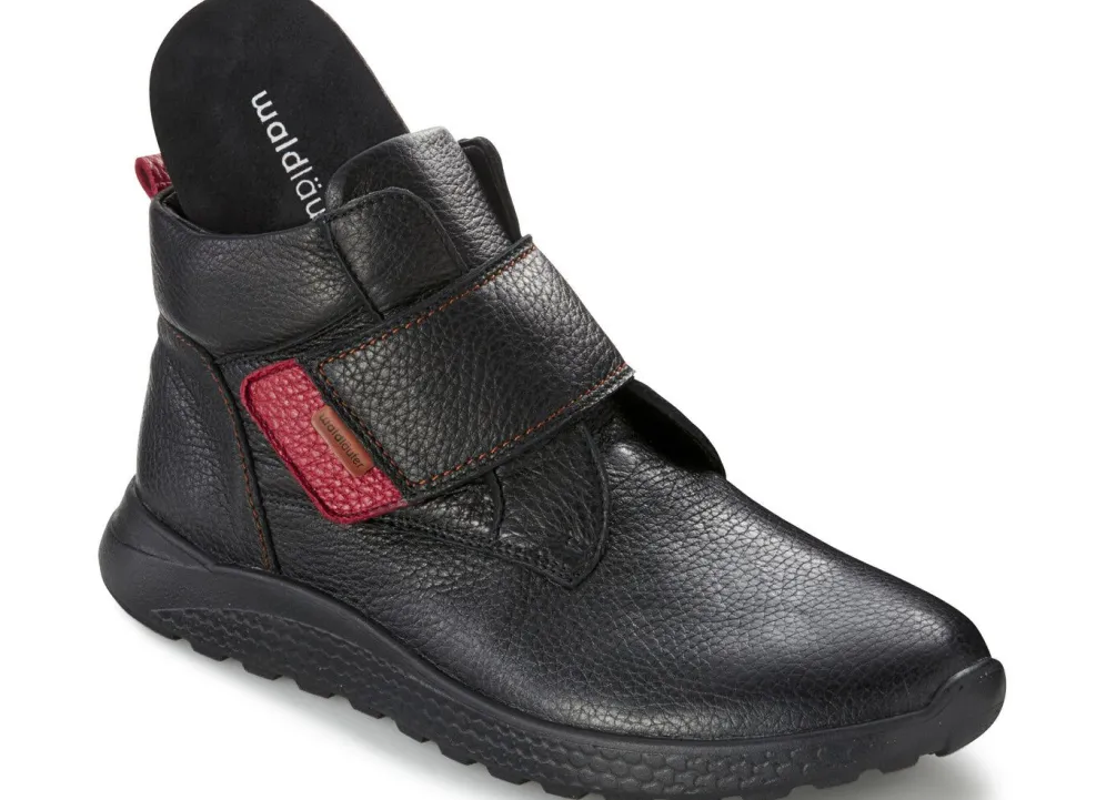 Schwarz-rote Stiefeletten aus weichem, genarbtem Hirsch-Nappaleder, mit verstellbarer Klettspange: in Weite H, Innenreißverschluss, Textilfutter, herausnehmbares Fußbett, superleichte EVA-Profilsohle sowie 15 mm Keilabsatz. Schafthöhe ca. 9 cm
