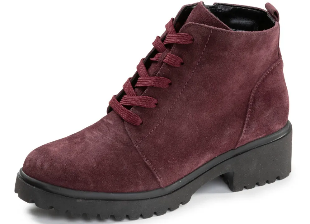 Stiefeletten aus weichem Veloursleder, mit Schnürung und praktischem Innenreißverschluss: Weite H, wärmendes Textilfutter, herausnehmbares Filz-Fußbett, leichte EVA-Profilsohle sowie 30 mm Absatz. Schafthöhe ca. 11 cm