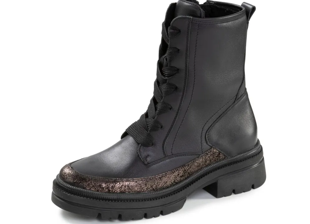 Stiefeletten aus bestem Velours- oder Nappaleder, mit effektvoll geprägtem, bronzefarben schimmerndem Besatz: Weite H, Schnürung, Innenreißverschluss, wärmendes Textilfutter, herausnehmbares Filz-Fußbett, PU-Luftpolster-Profilsohle, 20 mm Absatz. Schafthöhe ca. 18 cm