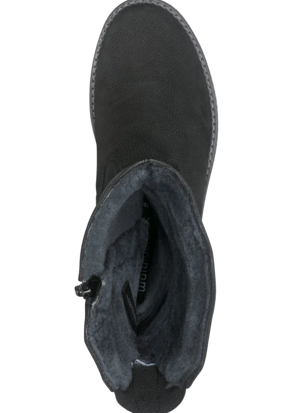 Warmer Stiefel aus bestem Rind-Veloursleder, mit Zierschnalle und rückwärtigen Gummizügen mit Klettspange: in Weite H, Innenreißverschluss, echtes, kuscheliges Lammfellfutter, herausnehmbares Fußbett, TR-Luftpolstersohle sowie 15 mm Keilabsatz. Schafthöhe ca. 32 cm, Wadenweite ca. 38 cm
