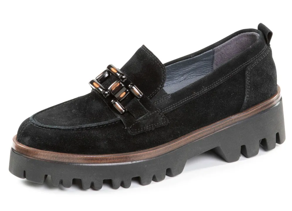 Angesagter Loafer aus bestem Veloursleder, mit Zier-Schmuck und seitlich eingesetzten Gummizügen: Weite H, Lederfutter, herausnehmbares Lederfußbett, PU-Luftpolster-Profilsohle, sowie 20 mm Absatz