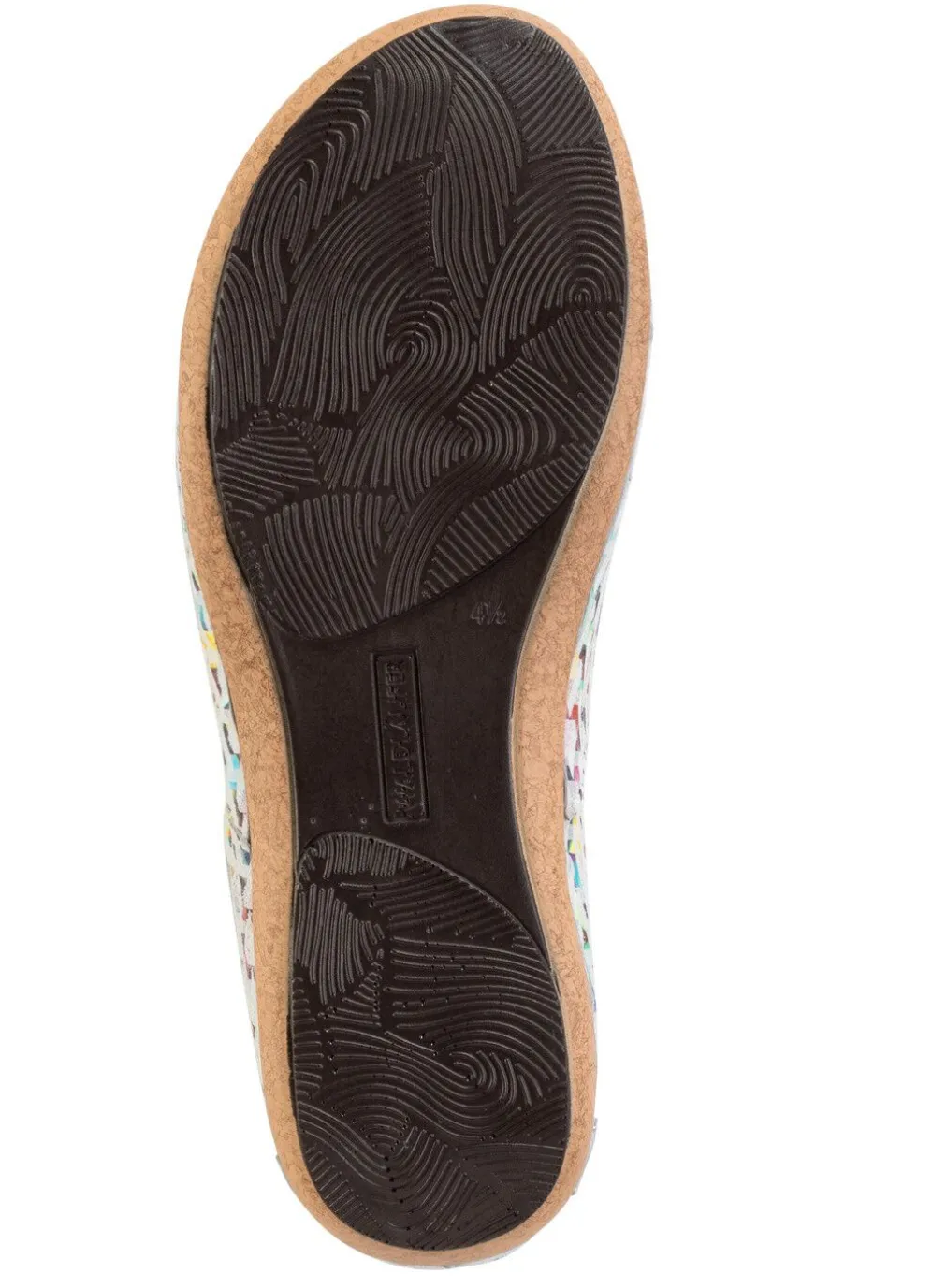 Sandale in Ecru-Bunt, aus effektvoll bedrucktem Nubukleder, mit zwei praktischen Klettspangen: Weite H, Lederfutter, herausnehmbares Lederfußbett, leichte PU-Riffelsohle sowie 25 mm Keilabsatz
