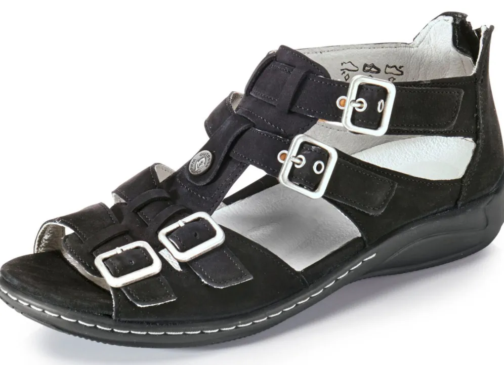 Sandale aus edlem Rind-Metallicleder, in Schwarz aus Rind-Nubukleder: Weite H, vier verstellbare Schließen, davon zwei mit Klettverschluss, Fersen-Reißverschluss, Lederfutter, herausnehmbares Lederfußbett, leichte PU-Riffelsohle sowie 25 mm Keilabsatz