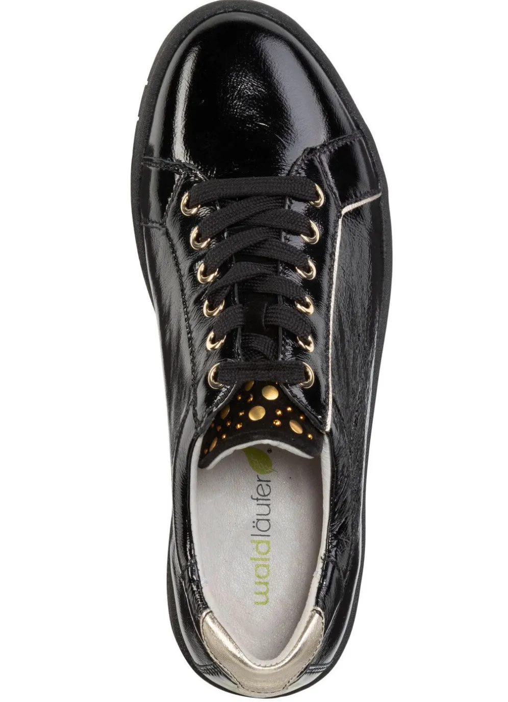 Schnürschuh aus weichem Knautschlackleder, mit dekorativer Nieten-Zunge: Weite H, Quartier mit Lederfutter, herausnehmbares Lederfußbett, leichte TR-Luftpolster-Profilsohle sowie 15 mm Keilabsatz
