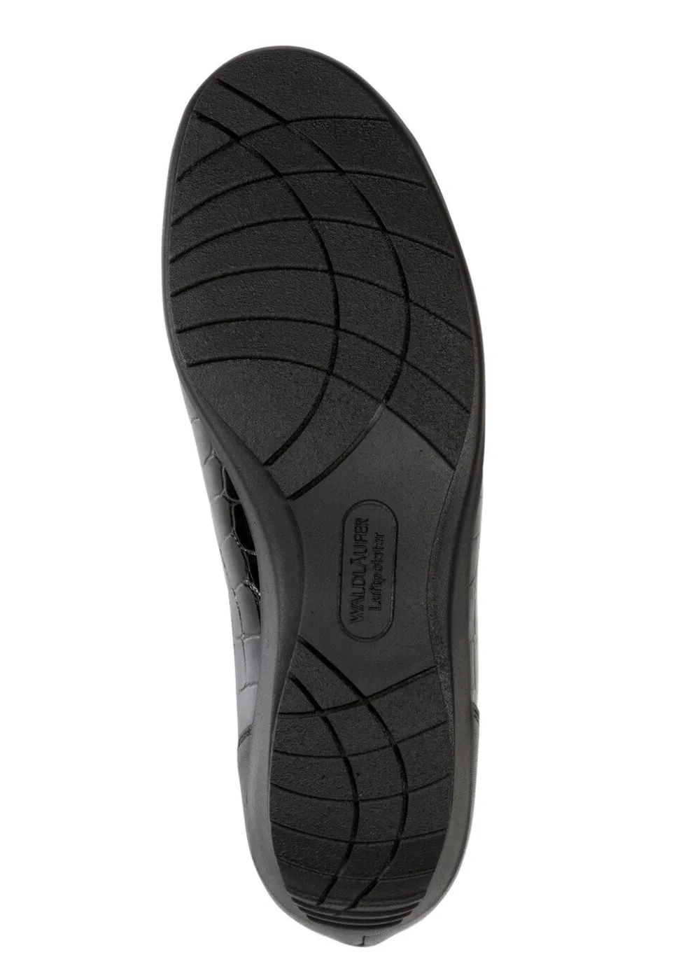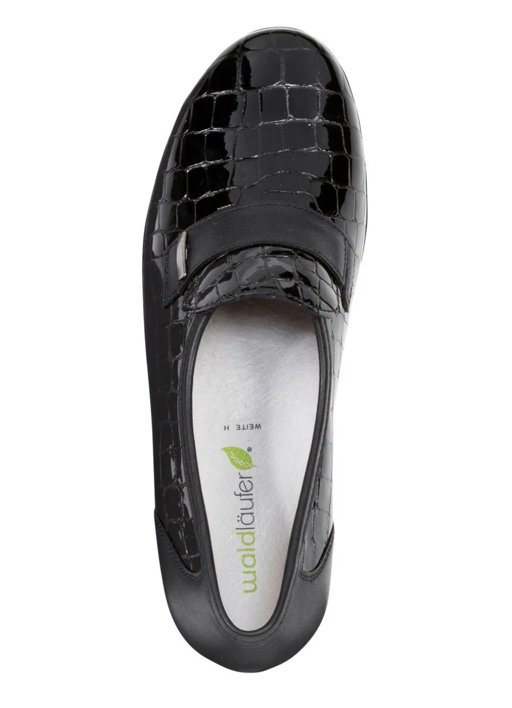 Schwarzer Slipper aus krokogeprägtem Lackleder und Nappaleder: in Weite H, verdeckter Gummizug, ledergefüttertes Quartier, herausnehmbares Lederfußbett, leichte Rubflex-Luftpolster-Profilsohle sowie 30 mm Keilabsatz