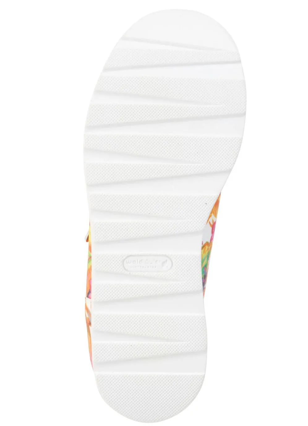 Sneaker in Weiß-Bunt aus beschichtetem, floral bedrucktem Textilmaterial, mit Schnürung und seitlichem Reißverschluss: Weite H, Futter, herausnehmbares Fußbett, leichte PU-Luftpolster-Profilsohle mit Plateau sowie 20 mm Keilabsatz