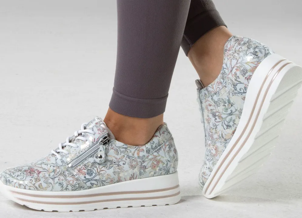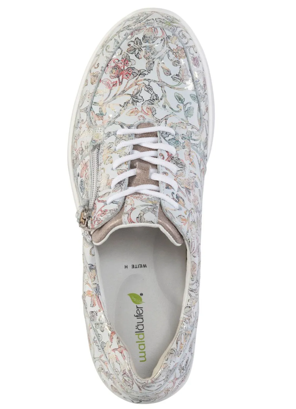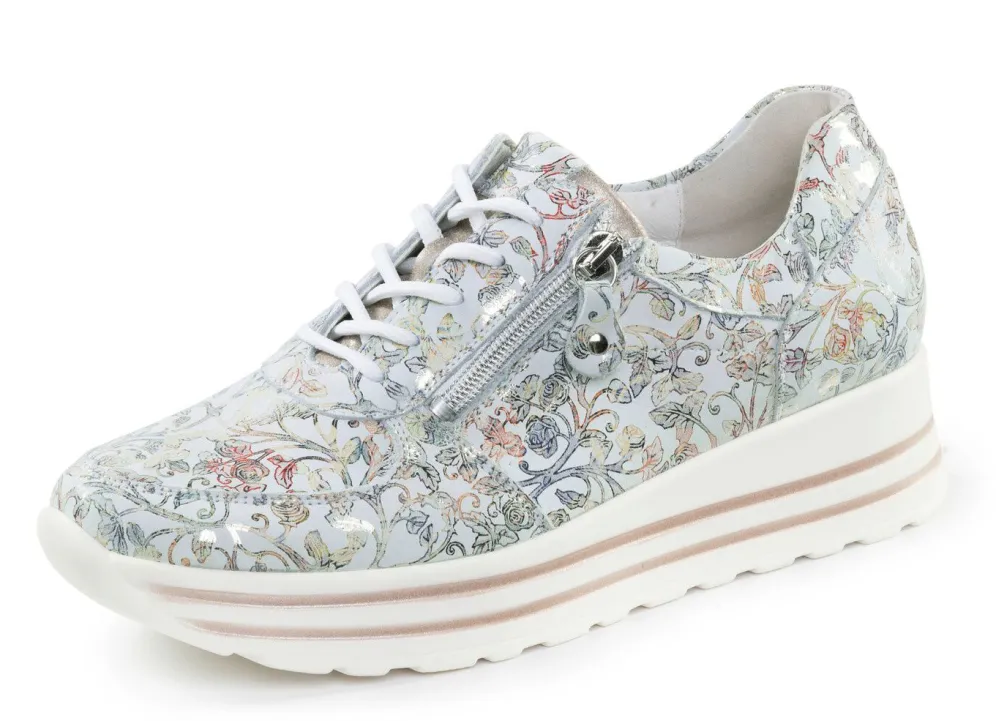 Sneaker in Eisblau-Bunt, aus floral bedrucktem, zart glänzendem Nubukleder: Weite H, Schnürung, Seitenreißverschluss, ledergefüttertes Quartier, herausnehmbares Lederfußbett, leichte PU-Luftpolster-Profilsohle mit Plateau, 20 mm Keilabsatz