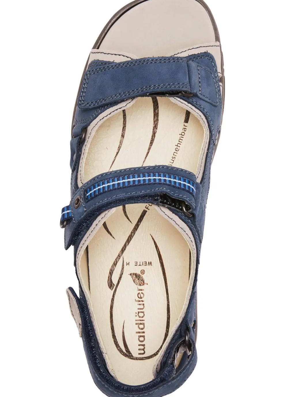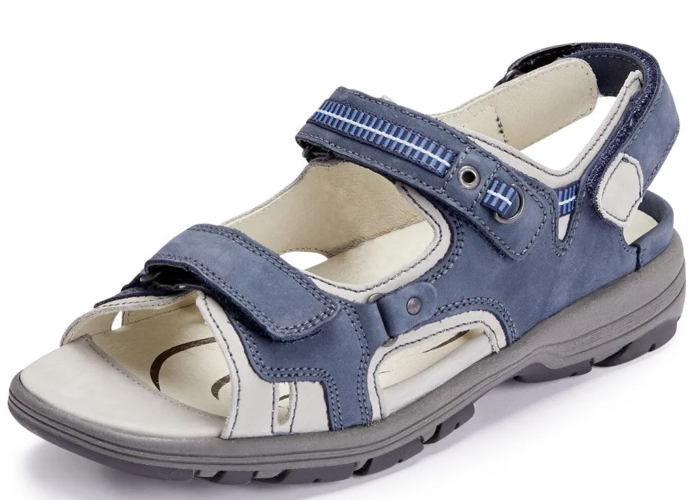 Sandalen aus Rind-Nubuk- oder Nappaleder, mit Textilbesätzen: Weite H, drei Klettspangen, Lederfutter, herausnehmbares Lederfußbett mit Fersenpolster, TR-Profilsohle, 20 mm Keilabsatz