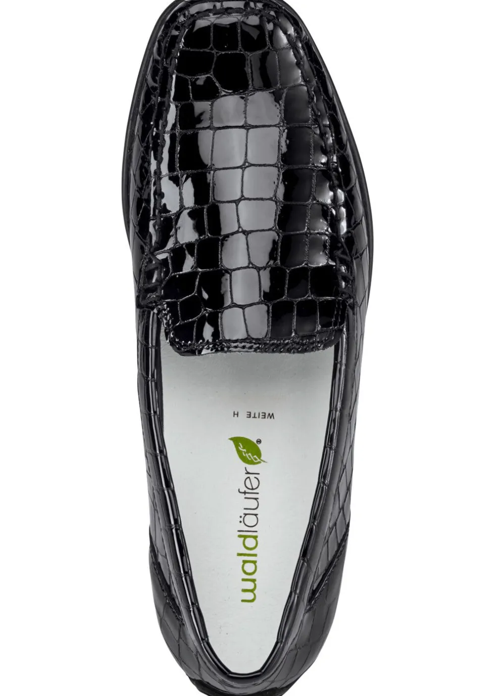 Schwarze Slipper in Mokassin-Machart, aus krokogeprägtem Rind-Lackleder: in Weite H, Lederfutter, herausnehmbares Lederfußbett, TPS-Noppensohle sowie 20 mm Keilabsatz
