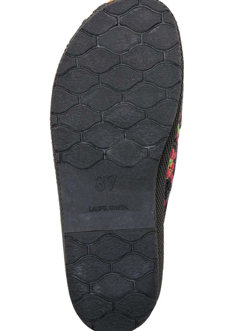 Hausschuhe in Anthrazit aus Textilmaterial, mit bunter Blüten-Stickerei: Warmfutter und Fußbettbezug aus reiner Schurwolle, leichte Synthetik-Laufsohle sowie 20 mm Keilabsatz
