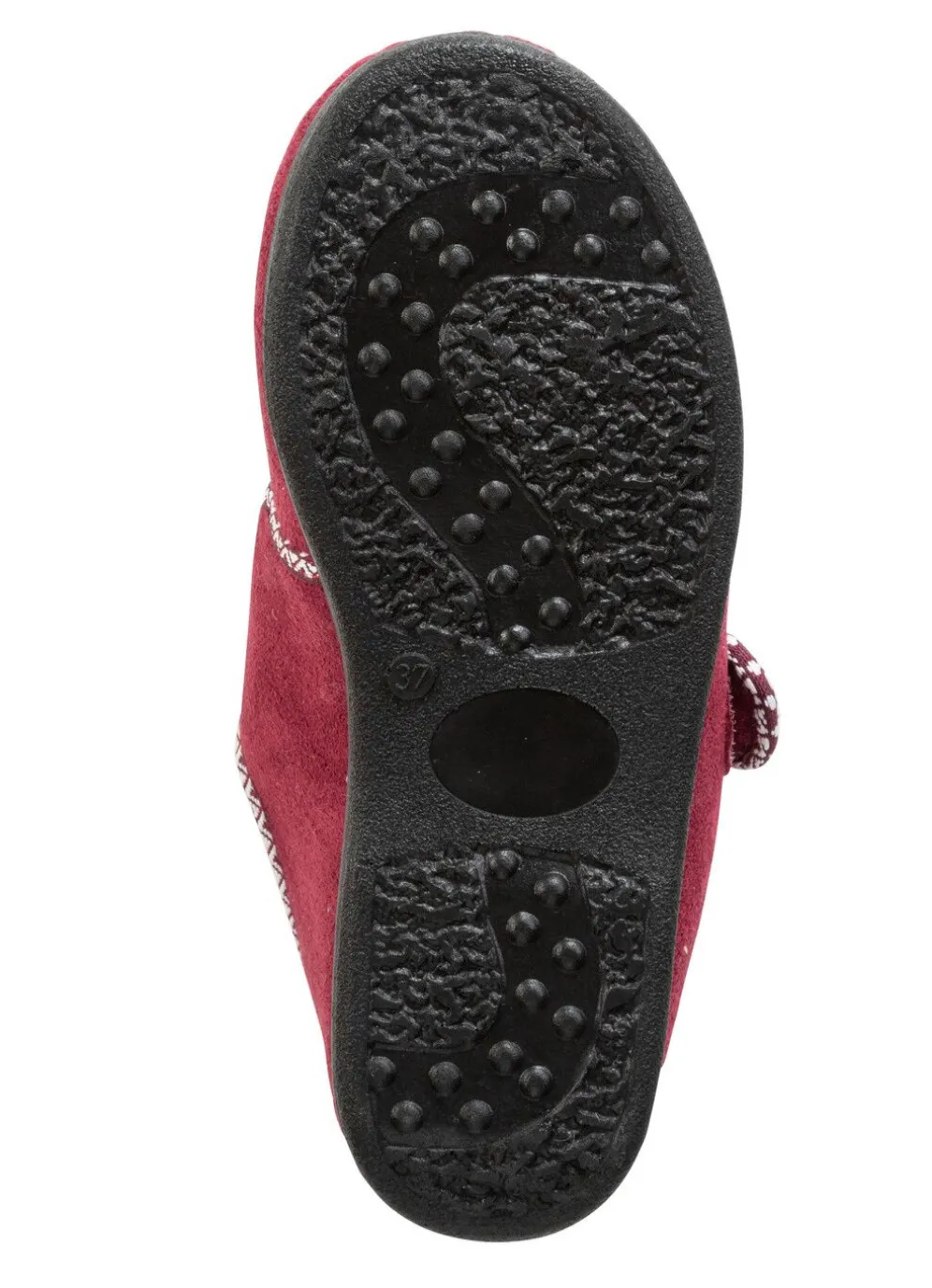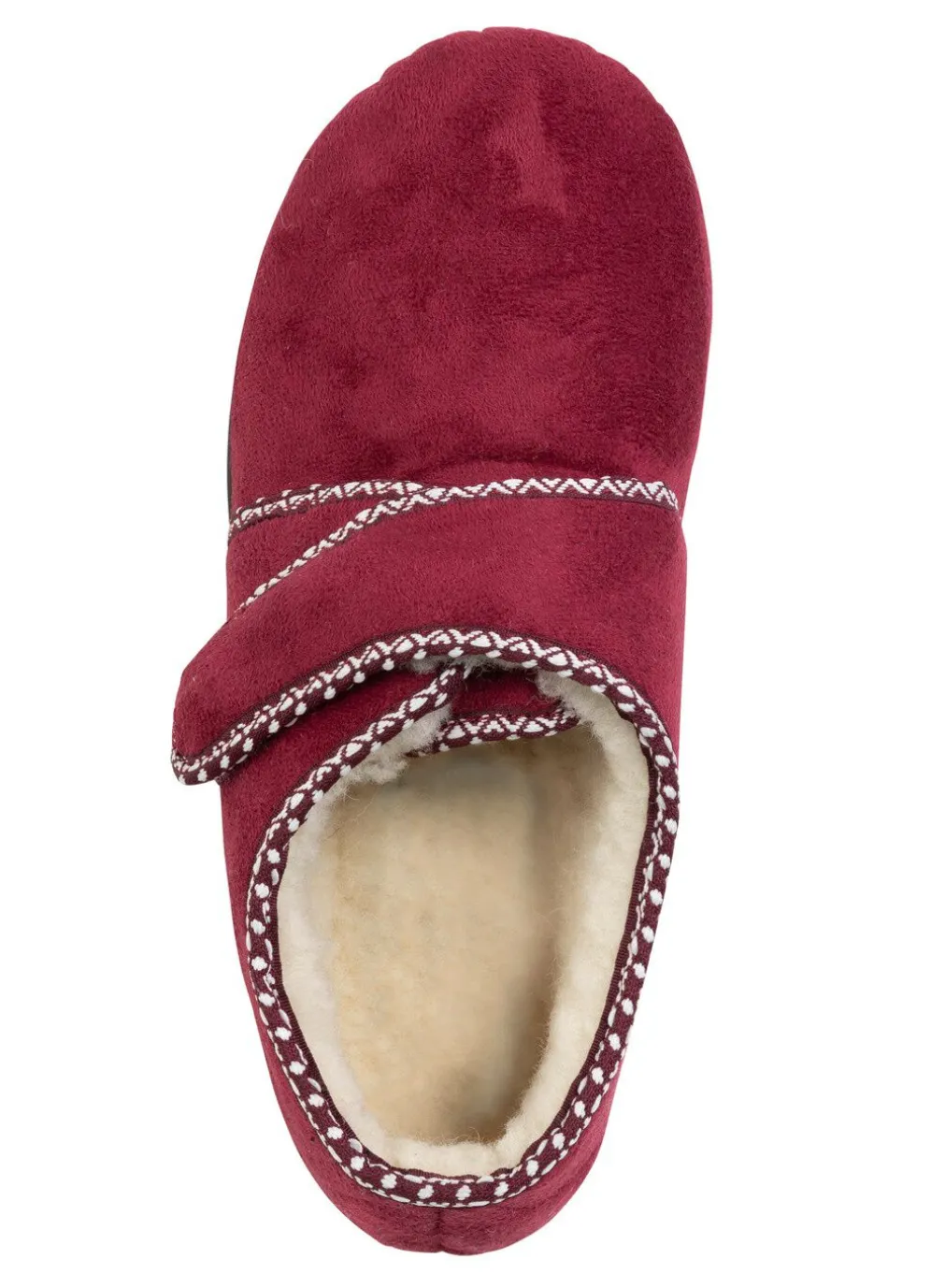 Hausschuhe aus weichem Veloursmaterial mit flotter Bordüre: Weite H, verstellbare Klettspange, Warmfutter und Decksohlenbezug aus 100% Wolle, superleichte PU-Laufsohle sowie 15 mm Keilabsatz