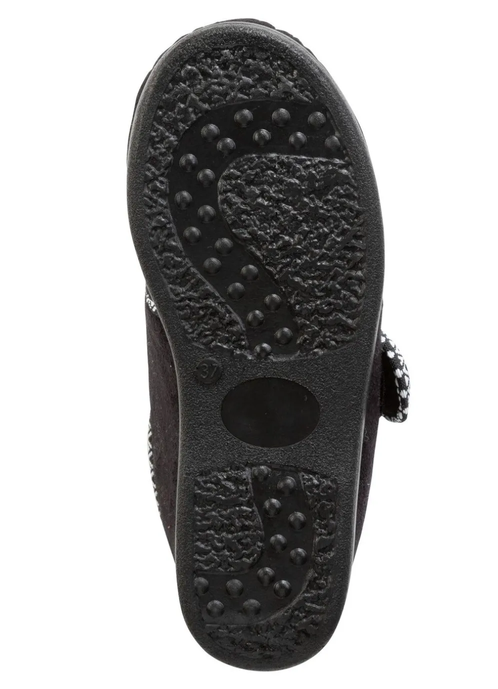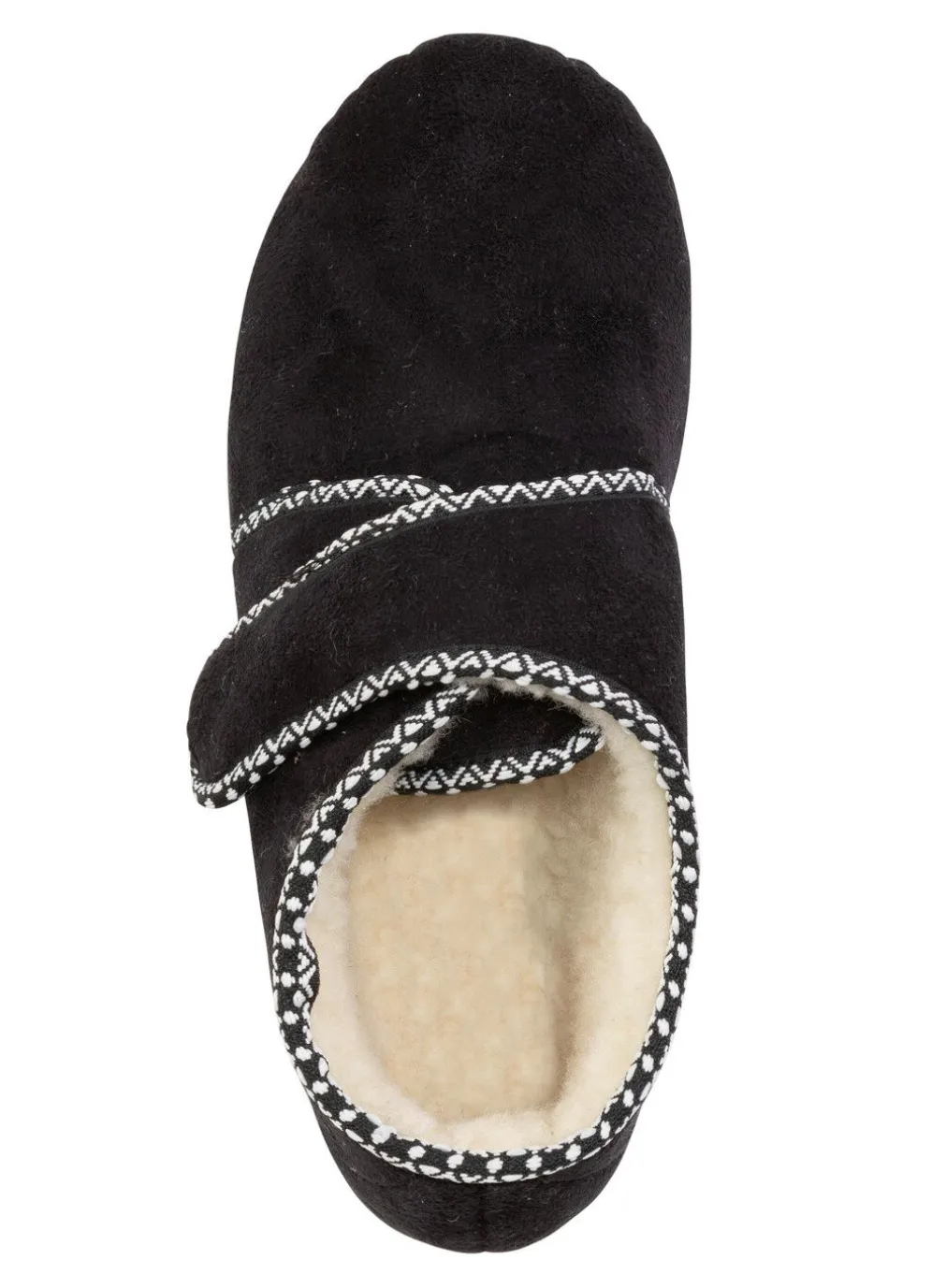 Hausschuhe aus weichem Veloursmaterial mit flotter Bordüre: Weite H, verstellbare Klettspange, Warmfutter und Decksohlenbezug aus 100% Wolle, superleichte PU-Laufsohle sowie 15 mm Keilabsatz