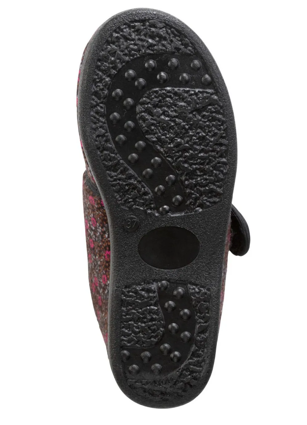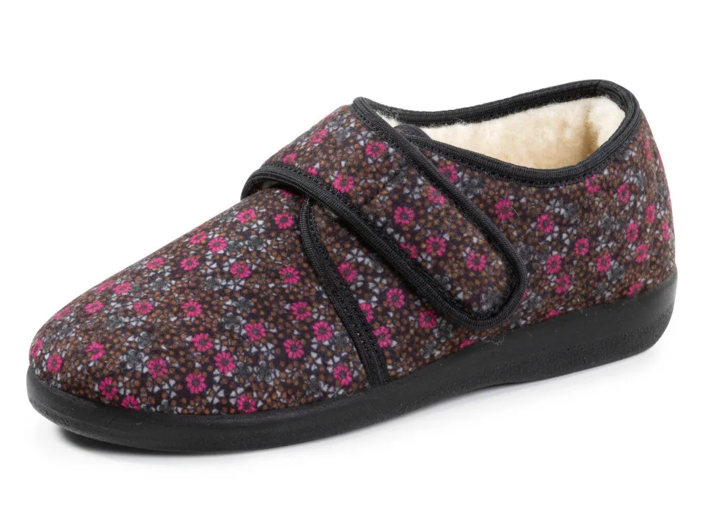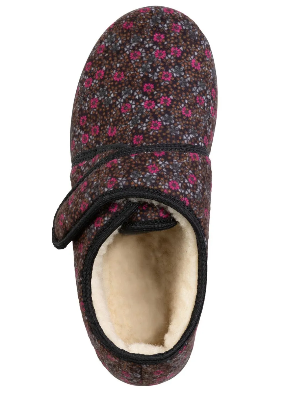 Hausschuhe in Schwarz-Bunt aus floral bedrucktem Textilmaterial, mit Klettverschluss: Weite H, Warmfutter und Decksohlenbezug aus reiner Schurwolle, leichte PU-Laufsohle sowie 15 mm Keilabsatz
